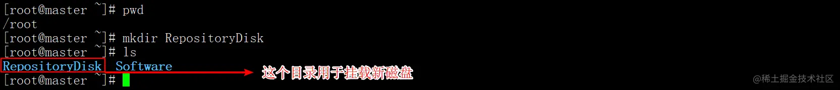 1.在/root目录下创建RepositoryDisk文件夹来挂载新磁盘,该目录和文件夹可以任意,按照自己的需求来,可以挂载到任意目录下