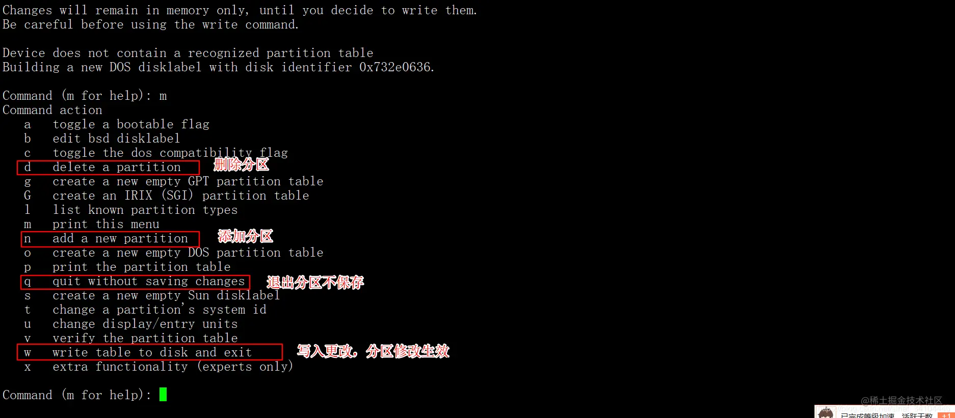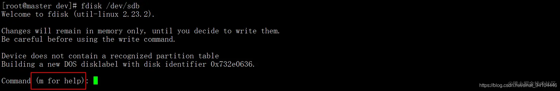 3.使用命令 fdisk /dev/磁盘名称 进行分区,如 fdisk /dev/sdb