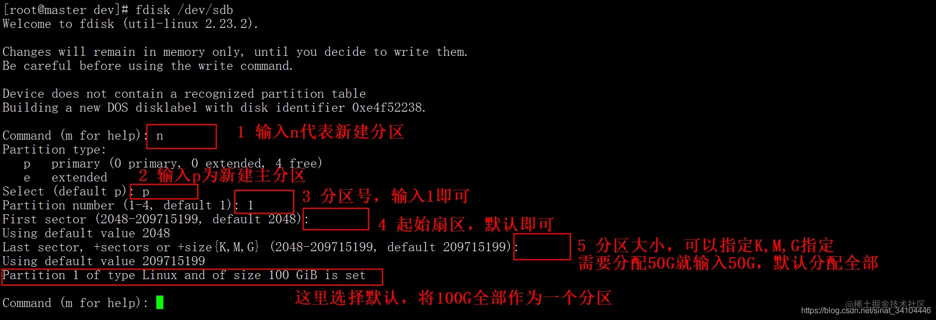输入n添加新分区输入p新建主分区指定分区编号,输入1即可指定起始扇区,默认即可,不推荐更改指定结束扇区,代表分区大小,可以使用K,M,G指定分区大小,例如分配50G则输入50G即可6. 执行上述操作之后,需要输入 w 确定分区,不然不会生效