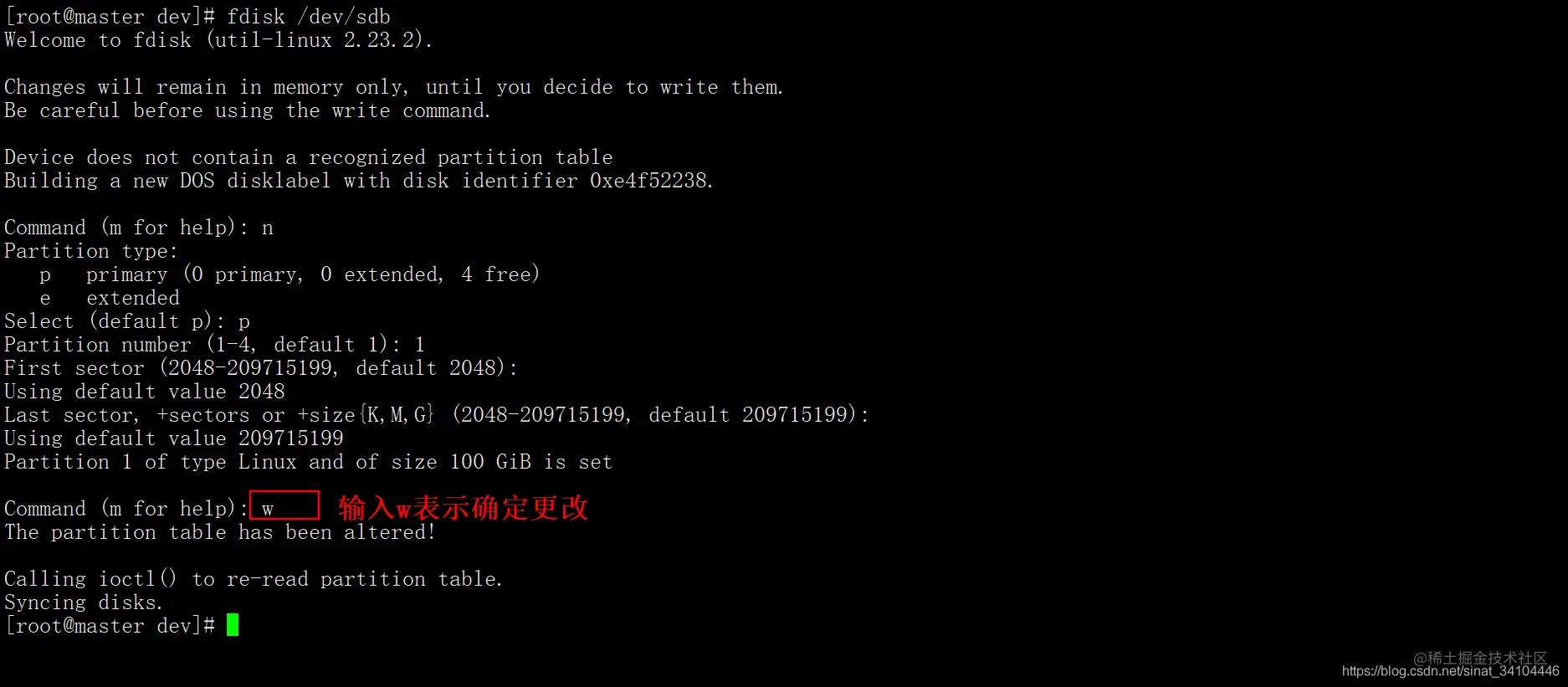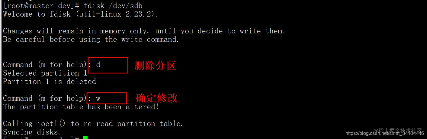7.如果是删除分区,则fdisk /dev/sdb执行之后,输入d表示删除分区,然后输入w确认更改