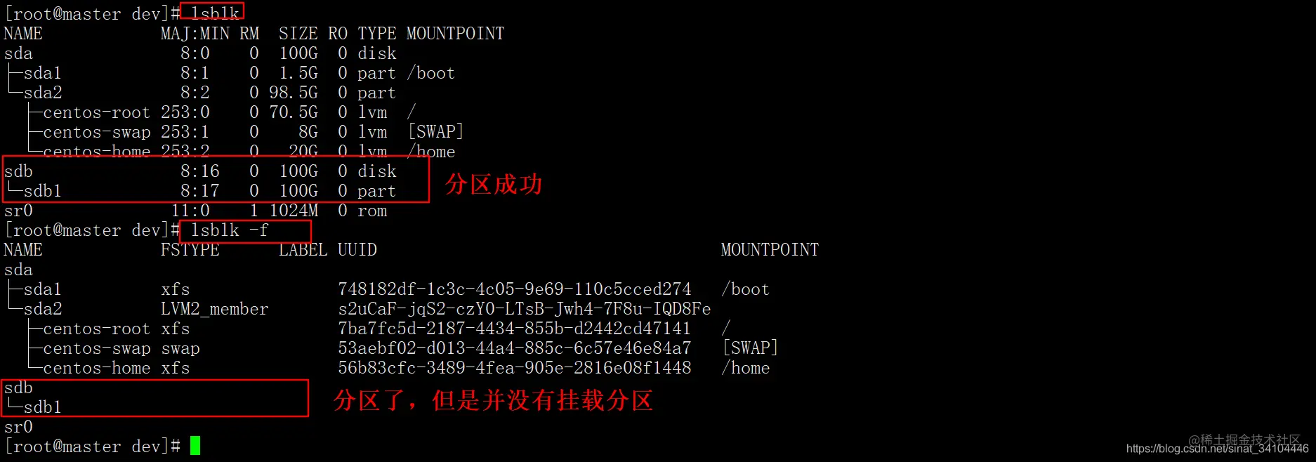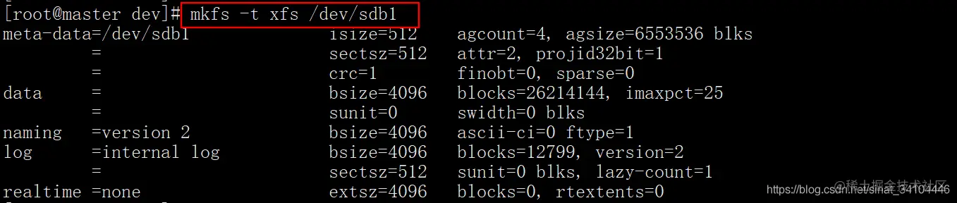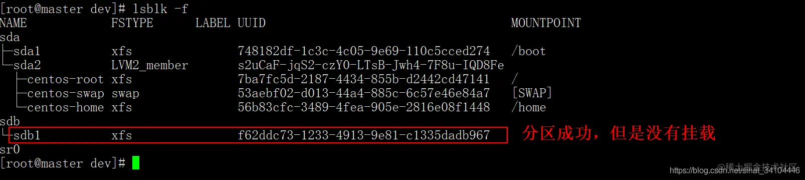 mkfs -t xfs /dev/sdb1(sdb1是sdb磁盘分区后得到的)2.再次使用 lsblk -f 可以看到格式分区成功,但是还没有挂载点