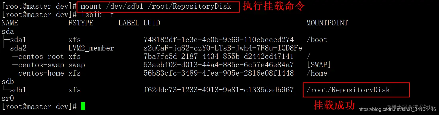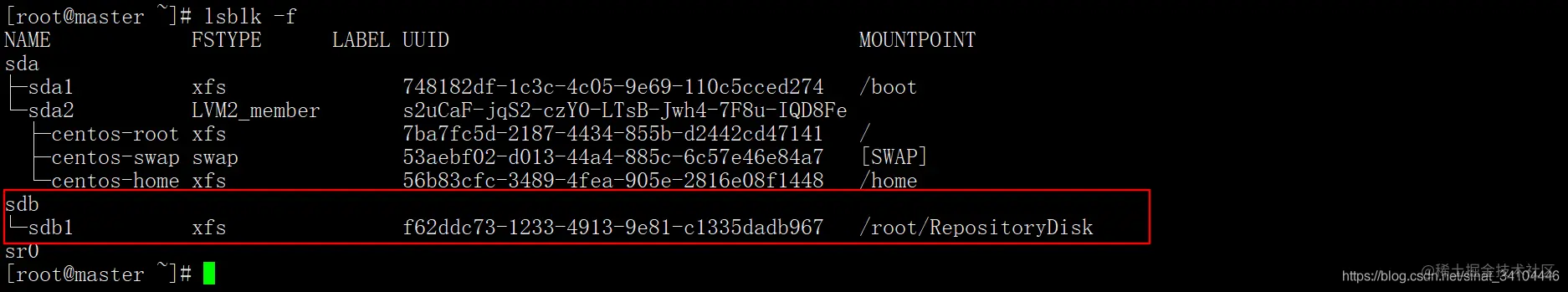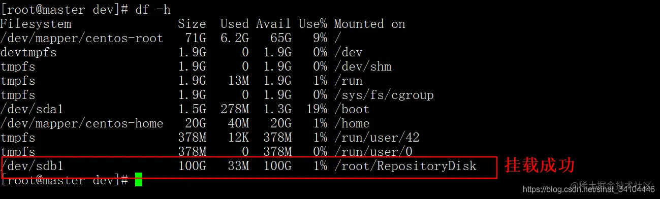 mount /dev/sdb1 /root/RepositoryDisklsblk -f4.通过 df -h 命令查看是否真的成功,可以看到系统已经能正确加载新磁盘
