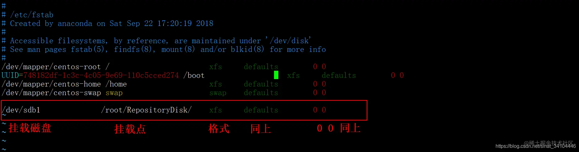 第一个需要挂载的分区,如/dev/sdb1第二个分区挂载点,如挂载到/root/RepositoryDisk下第三个分区格式,和自己格式化分区时指定格式一致第四个直接defaults即可,和系统保持一致第五个和系统保持一致,输入0即可第六个和系统保持一致,输入0即可5.输入完成后保存退出,然后重启虚拟机,查看是否自动加载,重启之后可以看到成功自动加载