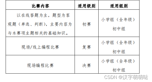 (二)分级/分组内容 1.本赛项晋级过程包括初赛(在线预选赛)、复赛(地区选拔 赛)和决赛(全国总决赛)三个级别。 2.选手报名组别按参赛选手在读学段分为小学组(全年级)、初 中组。 3.本赛项以个人形式报名