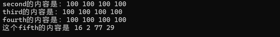 #define _CRT_SECURE_NO_WARNINGS 1// constructing vectors#include <iostream>#include <vector>using namespace std;int main(){ // constructors use order as described above: vector<int> first; //构造一个空的vector vector<int> second(4, 100); //构造一个4个大小,val是100的vector vector<int> third(second.begin(), second.end()); //用迭代器去初始化third这个容器 vector<int> fourth(third); //用使用拷贝构造初始化fourth cout << "second的内容是:"; for (auto e : second) { cout << e <<' '; } cout << endl; cout << "third的内容是:"; for (auto e : third) { cout << e << ' '; } cout << endl; cout << "fourth的内容是:"; for (auto e : fourth) { cout << e << ' '; } cout << endl; // 迭代器构造也可以使用数组去构造: int myints[] = { 16,2,77,29 }; vector<int> fifth(myints, myints + sizeof(myints) / sizeof(int)); cout << "这个fifth的内容是"; for (vector<int>::iterator it = fifth.begin(); it != fifth.end(); ++it) cout << ' ' << *it; cout << endl; return 0;}