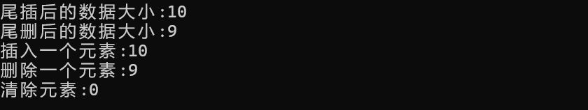 #include <iostream>#include <vector>using namespace std;int main(){ vector<int> myvector; for (int i = 0; i < 10; i++) { myvector.push_back(i);//尾插一个元素 } cout << "尾插后的数据大小:"; cout << myvector.size() << endl; myvector.pop_back(); cout << "尾删后的数据大小:"; cout << myvector.size() << endl; cout << "插入一个元素:"; myvector.insert(myvector.begin(), 1);//这里的位置需要用迭代器 cout << myvector.size() << endl; cout << "删除一个元素:"; myvector.erase(myvector.begin());//删除也需要用迭代器 cout << myvector.size() << endl; cout << "清除元素:"; myvector.clear(); cout << myvector.size() << endl; return 0;}