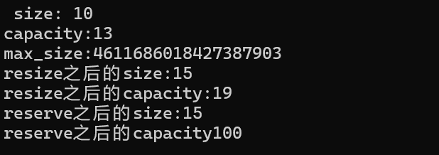 #include <iostream>#include <vector>using namespace std;int main(){vector<int> myints;for (int i = 0; i < 10; i++) myints.push_back(i);cout << " size: " << myints.size() << endl;cout << "capacity:" << myints.capacity() << endl;cout << "max_size:" << myints.max_size() << endl;myints.resize(15);cout << "resize之后的size:" << myints.size() << endl;cout << "resize之后的capacity:" << myints.capacity() << endl;myints.reserve(100);cout << "reserve之后的size:" << myints.size() << endl;cout << "reserve之后的capacity" << myints.capacity() << endl;return 0;}