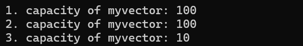#define _CRT_SECURE_NO_WARNINGS 1// vector::shrink_to_fit#include <iostream>#include <vector>using namespace std;int main(){vector<int> myvector(100);cout << "1. capacity of myvector: " << myvector.capacity() << endl;myvector.resize(10);cout << "2. capacity of myvector: " << myvector.capacity() << endl;myvector.shrink_to_fit();cout << "3. capacity of myvector: " << myvector.capacity() << endl;return 0;}