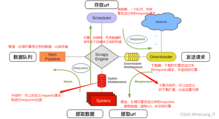 Spiders(爬虫组件)定义了整个网页的爬取逻辑和内容解析规则,负责生成新的请求并解析相应的响应。Engine(引擎)负责整个框架组件的通讯、信号和数据传递等。Scheduler(调度器)主要功能是将引擎发来的网络请求存储在组件队列中,完成一次请求时将请求再次传递给引擎。Downloader(下载器)下载各种爬取的网页,并根据框架的调度将下载的网页传递给Spider。Item Pipeline(项目管道)定义了爬取程序中的数据结构,获取爬取网页的数据,清洗并存储在数据库中。Spider Middlewares(Spider中间件)根据实际开发爬取框架需求,可以在操作引擎和Spider中自定义组件功能。