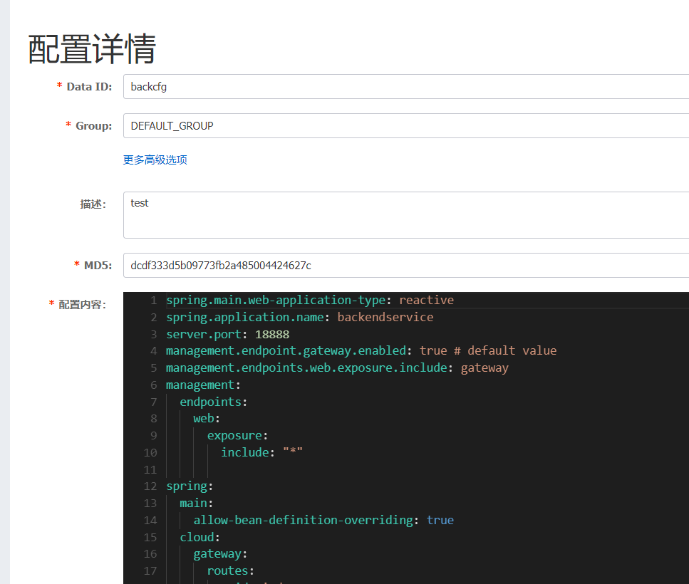 在这种情况下,Spring Cloud Gateway会去Nacos配置中心寻找一个名为backcfg