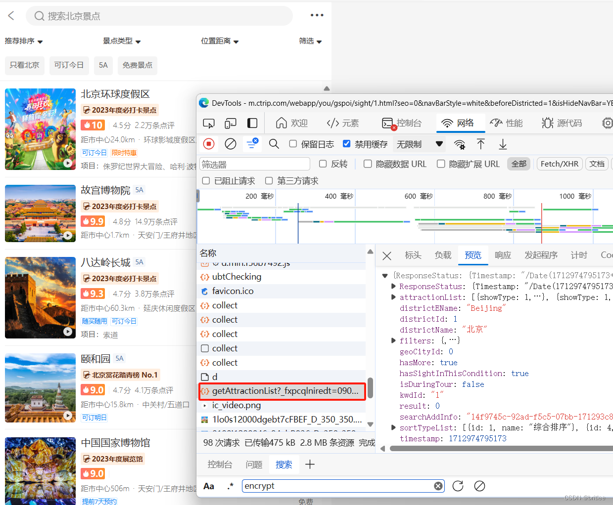 url = 'https://m.ctrip.com/restapi/soa2/18109/json/getAttractionList?_fxpcqlniredt=09031015313388236487&x-traceID=09031015313388236487-1712974794650-8267936' data = {"index":1,"count":10,"sortType":1,"isShowAggregation":true,"districtId":1,"scene":"DISTRICT","pageId":"214062","traceId":"14f9745c-92ad-f5c5-07bb-171293c80647","extension":[{"name":"osVersion","value":"10"},{"name":"deviceType","value":"windows"}],"filter":{"filterItems":[]},"crnVersion":"2020-09-01 22:00:45","isInitialState":true,"head":{"cid":"09031015313388236487","ctok":"","cver":"1.0","lang":"01","sid":"8888","syscode":"09","auth":"","xsid":"","extension":[]}}