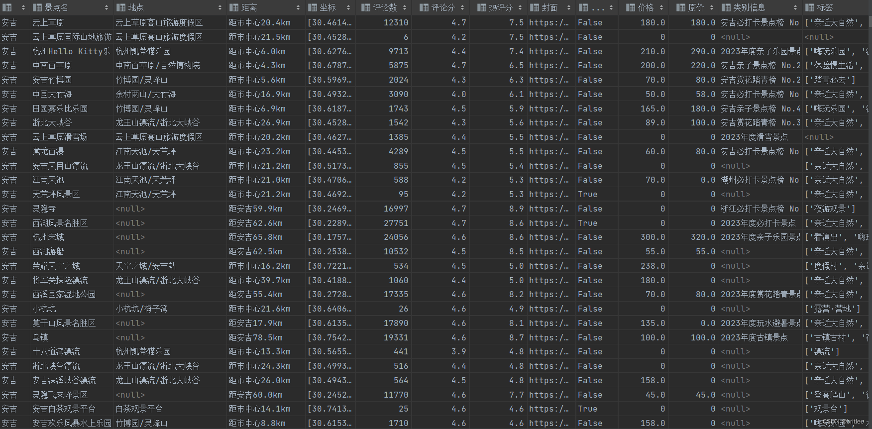 f = open('csv/全国各景点全.csv', 'w', encoding="utf-8", newline='') csvwrite = csv.writer(f)csvwrite.writerow(['城市', '景点名', '地点', '距离', '坐标', '评论数','评论分','热评分','封面','是否免费','价格','原价','类别信息','标签','是否5A']) csvwrite.writerow([city,poiName,displayField,distanceStr,coordinate,commentCount,commentScore,heatScore,coverImageUrl,isFree,price,marketPrice,sightCategoryInfo,tagNameList,sightLevelStr])