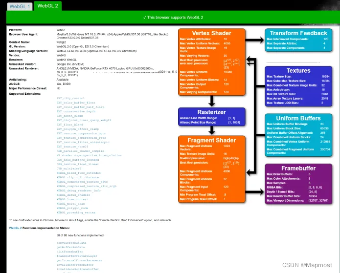 WebGL在桌面和移动设备上的所有主流浏览器中得到广泛支持,包括 Apple (Safari)、Google (Chrome)、Microsoft (Edge)、Opera (Opera Web 浏览器) 和 Mozilla (Firefox)。然而,由于WebGL是在显卡上运行的,其可用性还需要具有OpenGL功能支持的硬件。我们可以通过这个网站:WebGL Report 查看当前浏览器对WebGL1.0/2.0的支持情况,包括支持的attribute,uniform,varying数量,一些重要功能的支持程度等。