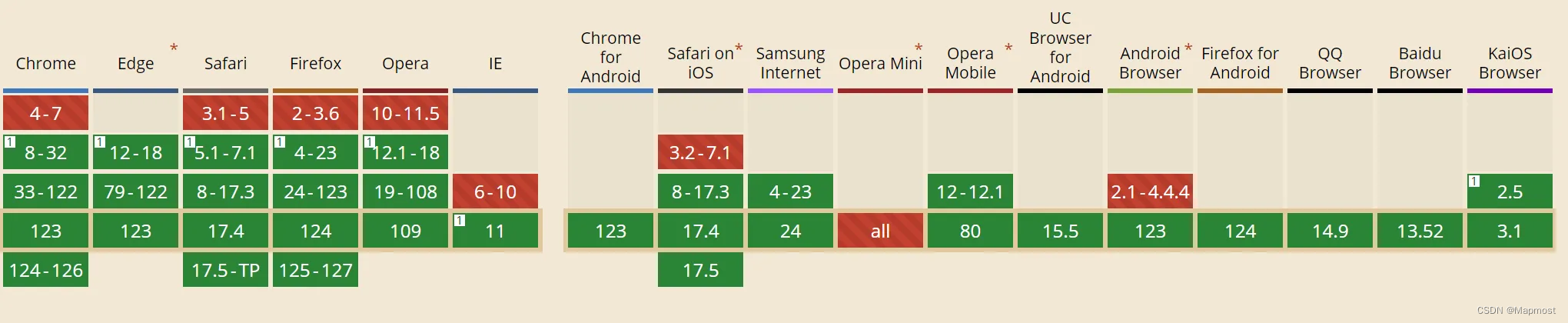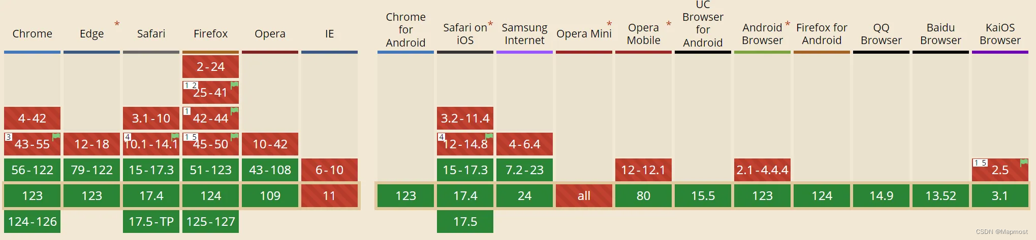 下面是目前桌面和移动设备上的主流浏览器对WebGL 1.0和WebGL 2.0的支持情况(注:颜色框红色表示支持,绿色表示不支持,颜色框内的数字为浏览器的版本):