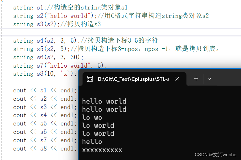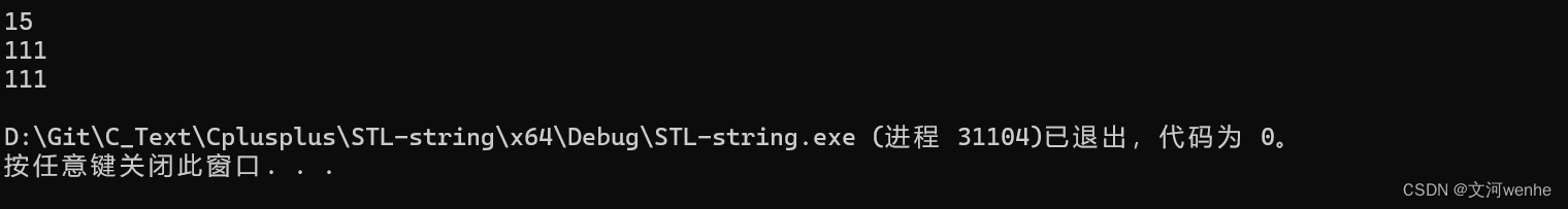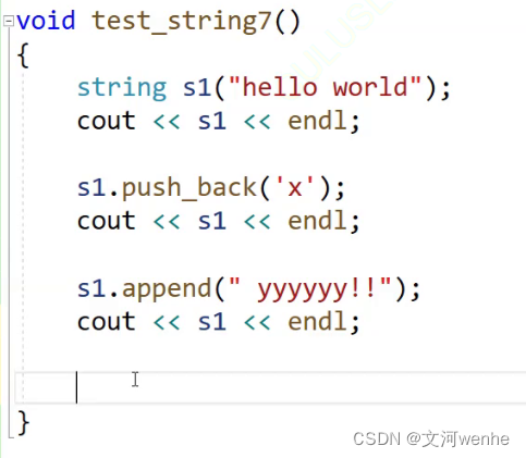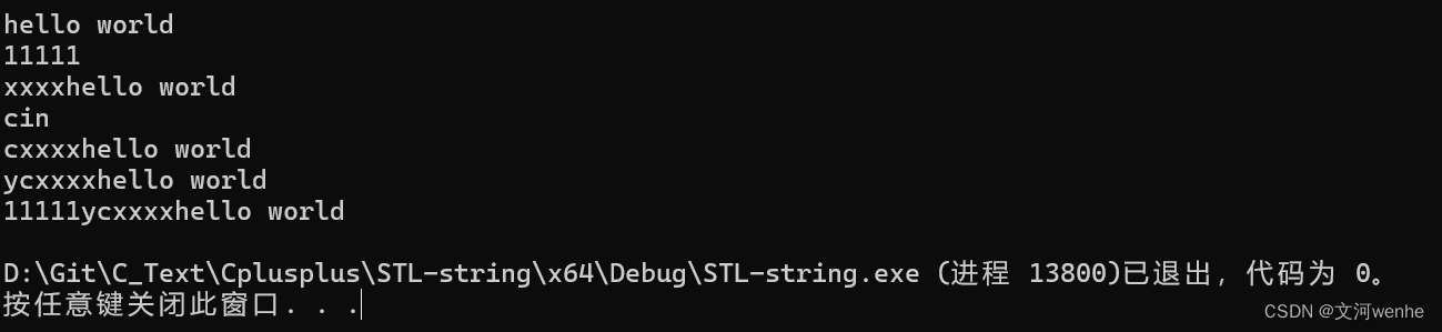 void test_string8(){string s1("hello world");cout << s1 << endl;s1.assign("11111");cout << s1 << endl;string s2("hello world");s2.insert(0, "xxxx");cout << s2 << endl;char ch = 'y';cin >> ch;s2.insert(0, 1, ch);//头插一个cout << s2 << endl;s2.insert(s2.begin(), 'y');cout << s2 << endl;s2.insert(s2.begin(), s1.begin(), s1.end());//把s1的头到尾,插入s2cout << s2 << endl;}