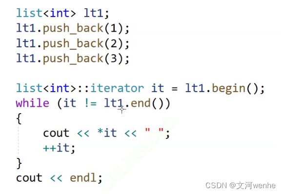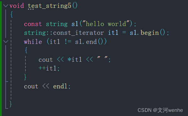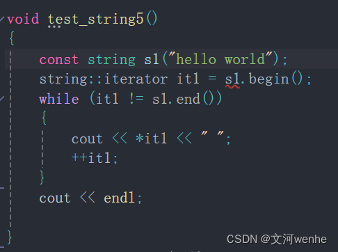void test_string4(){string s1("hello world");//iterator定义在类域里,只能在类域中搜索。string::iterator it1 = s1.begin();while (it1 != s1.end()){cout << *it1 << " ";++it1;}cout << endl;}