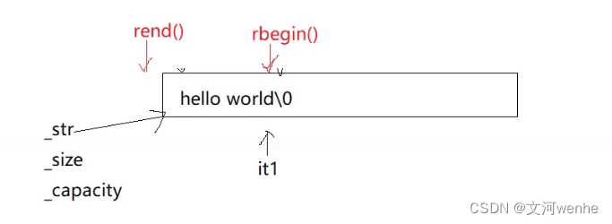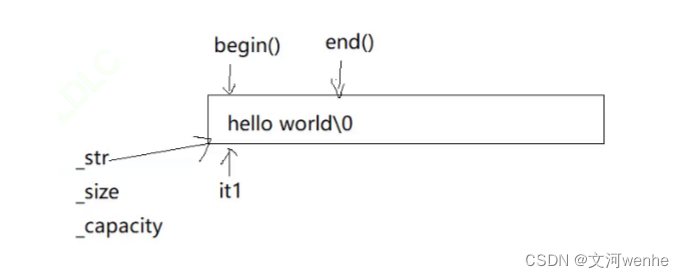我们可以把begin和end看作指针,begin指第一个字符,end指最后一个字符的下一个位置。结合代码,begin把第一个字符的地址给给it1,然后解引用it1取到值,++it1走到下一个位置,知道遇到end()就停止。