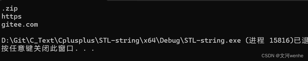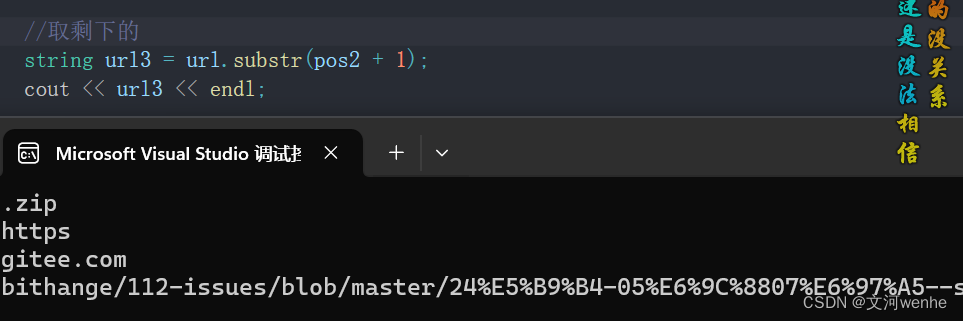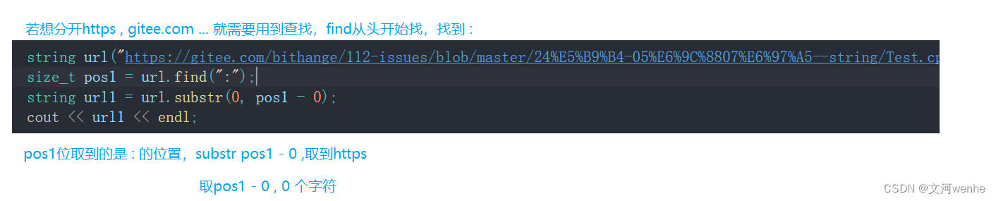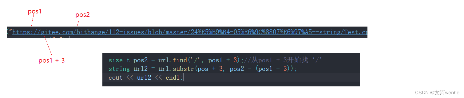 size_t pos2 = url.find('/', pos1 + 3);//从pos1 + 3开始找‘/’string url2 = url.substr(pos1 + 3, pos2 - (pos1 + 3));//左开右闭,从pos + 3开始取,取pos2 -(pos1+3)这么长cout << url2 << endl;