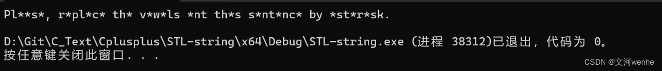 void test_string13(){std::string str("Please, replace the vowels int this sentence by asterisk.");std::size_t found = str.find_first_of("aeiou");while (found != std::string::npos){str[found] = '*';found = str.find_first_of("aeiou", found + 1);}std::cout << str << '\n';}