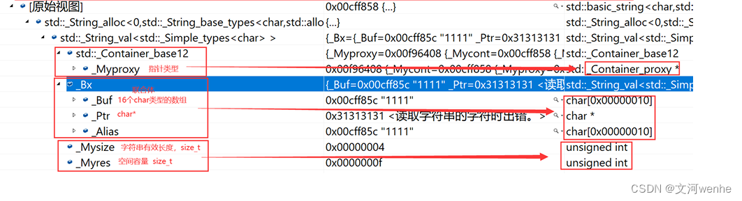 vs下string的结构 string总共占28个字节,内部结构稍微复杂一点,先是有一个联合体,联合体用来定义string中字。