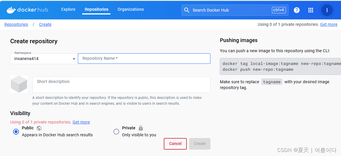 创建一个新仓库Create repository -》输入仓库名Repository Name -》 创建Create