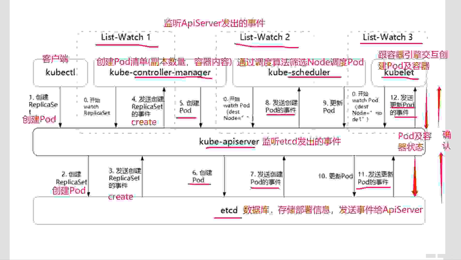 (1)这里有三个 List-Watch,分别是 Controller Manager(运行在 Master),Scheduler(运行在 Master),kubelet(运行在 Node)。 他们在进程已启动就会监听(Watch)APIServer 发出来的事件。