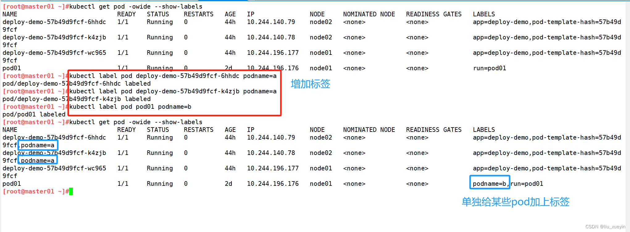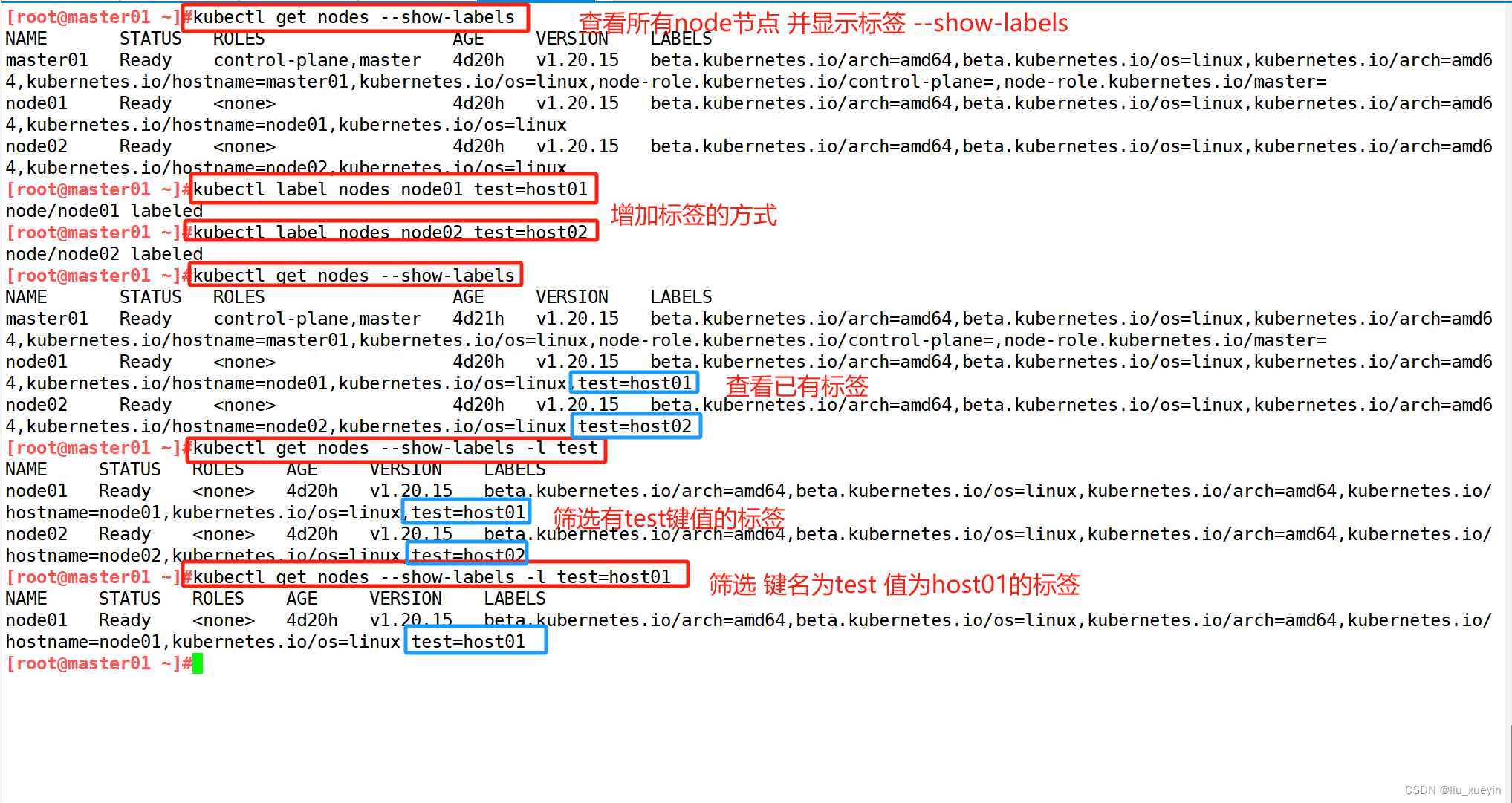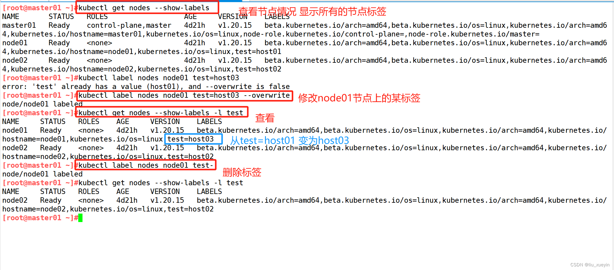 ##增加标签kubectl label -n 命名空间 资源类型 资源名称 标签键名=键值##删除标签kubectl label -n 命名空间 资源类型 资源名称 标签键名-(减号不能忽略)##修改标签kubectl label -n 命名空间 资源类型 资源名称 标签键名=新的键值 --overwrite##查询标签kubectl get -n 命名空间 资源类型 --show-label [-l 标签键名]或[-l 标签键名=键值](筛选)