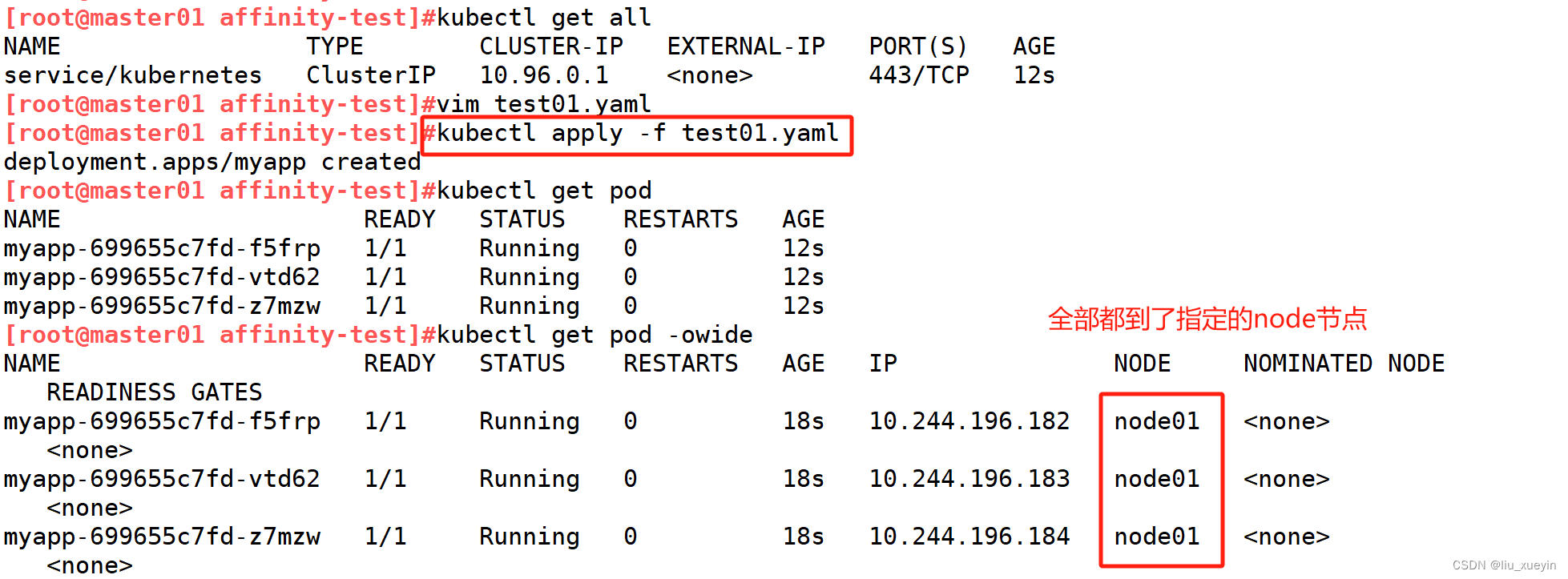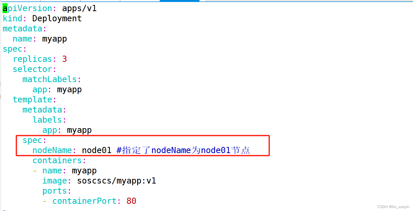 apiVersion: apps/v1kind: Deploymentmetadata: name: myappspec: replicas: 3 selector: matchLabels: app: myapp template: metadata: labels: app: myapp spec: nodeName: node01 #指定了nodeName为node01节点 containers: - name: myapp image: soscscs/myapp:v1 ports: - containerPort: 80