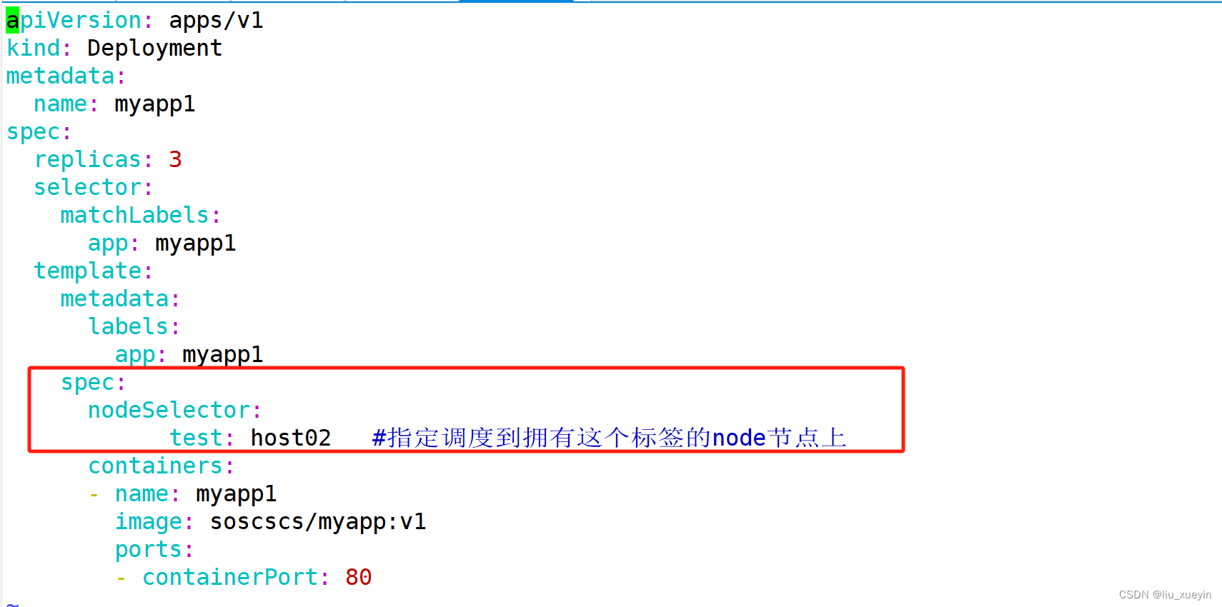 apiVersion: apps/v1kind: Deploymentmetadata: name: myapp1spec: replicas: 3 selector: matchLabels: app: myapp1 template: metadata: labels: app: myapp1 spec: nodeSelector: test: host02 #指定调度到拥有这个标签的node节点上 containers: - name: myapp1 image: soscscs/myapp:v1 ports: - containerPort: 80