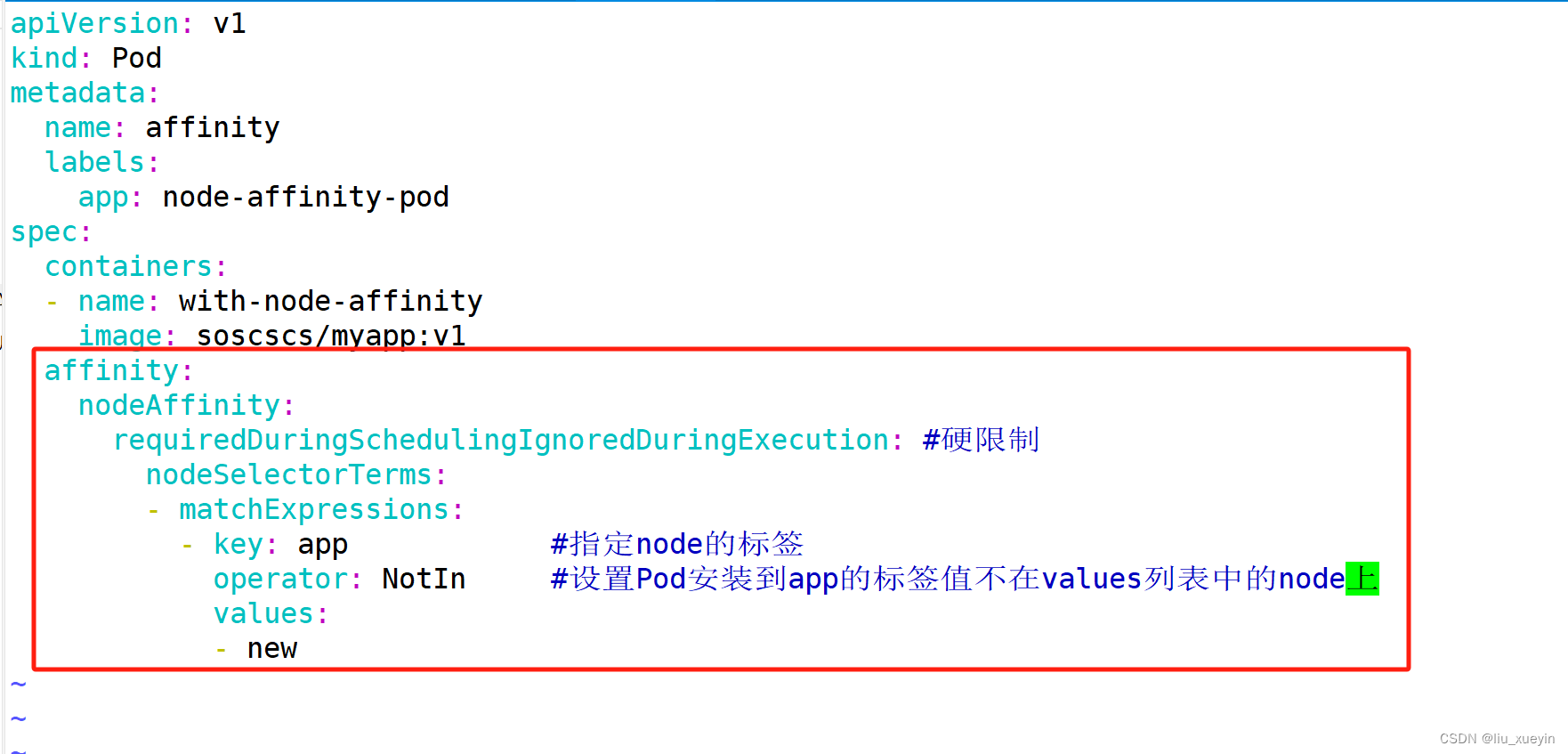 apiVersion: v1kind: Podmetadata: name: affinity labels: app: node-affinity-podspec: containers: - name: with-node-affinity image: soscscs/myapp:v1 affinity: nodeAffinity: requiredDuringSchedulingIgnoredDuringExecution: #硬限制 nodeSelectorTerms: - matchExpressions: - key: app #指定node的标签 operator: NotIn #设置Pod安装到app的标签值不在values列表中的node上 values: - new