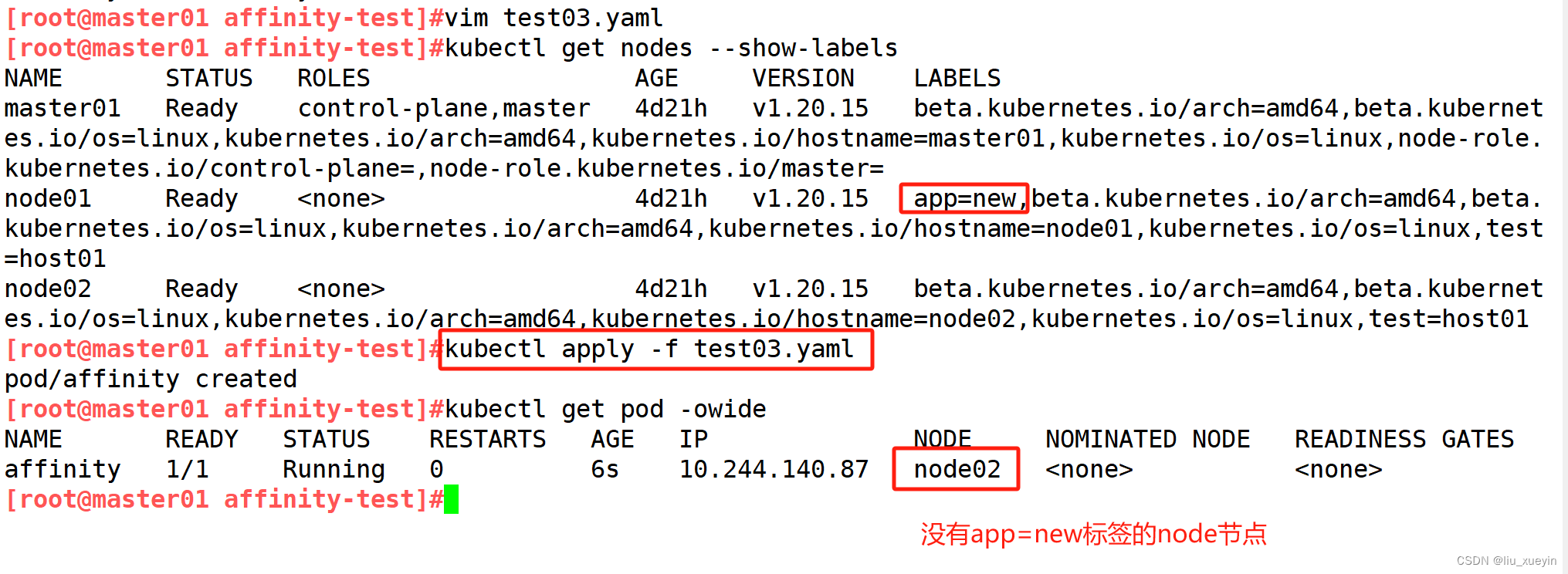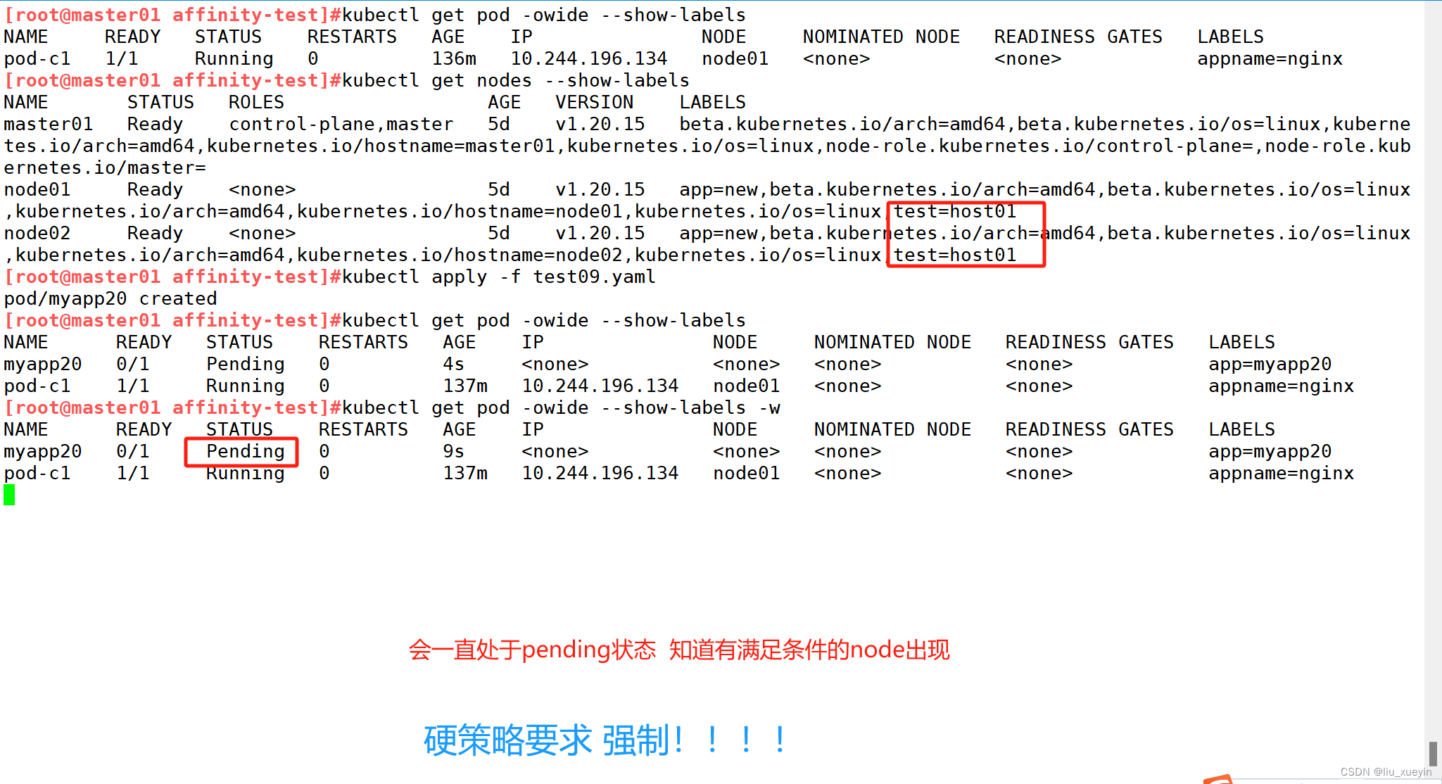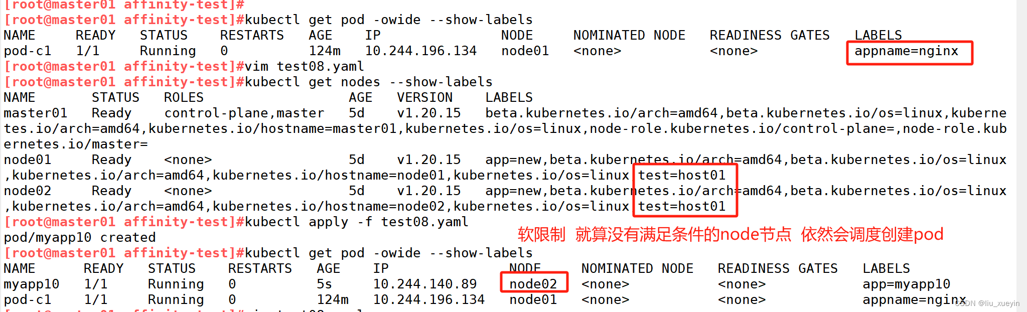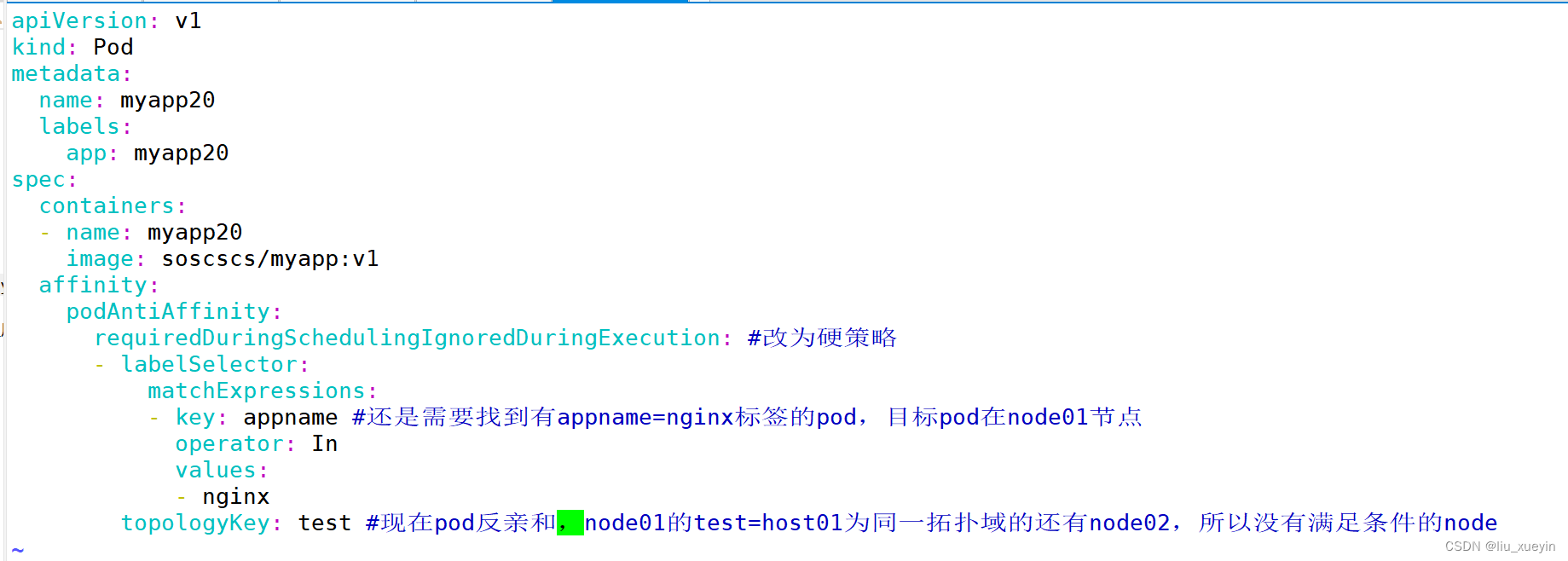 apiVersion: v1kind: Podmetadata: name: myapp20 labels: app: myapp20spec: containers: - name: myapp20 image: soscscs/myapp:v1 affinity: podAntiAffinity: requiredDuringSchedulingIgnoredDuringExecution: #改为硬策略 - labelSelector: matchExpressions: - key: appname #还是需要找到有appname=nginx标签的pod,目标pod在node01节点 operator: In values: - nginx topologyKey: test #现在pod反亲和,node01的test=host01为同一拓扑域的还有node02,所以没有满足条件的node