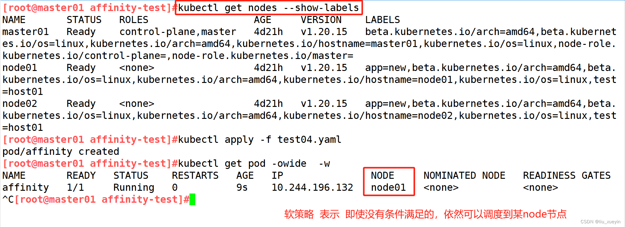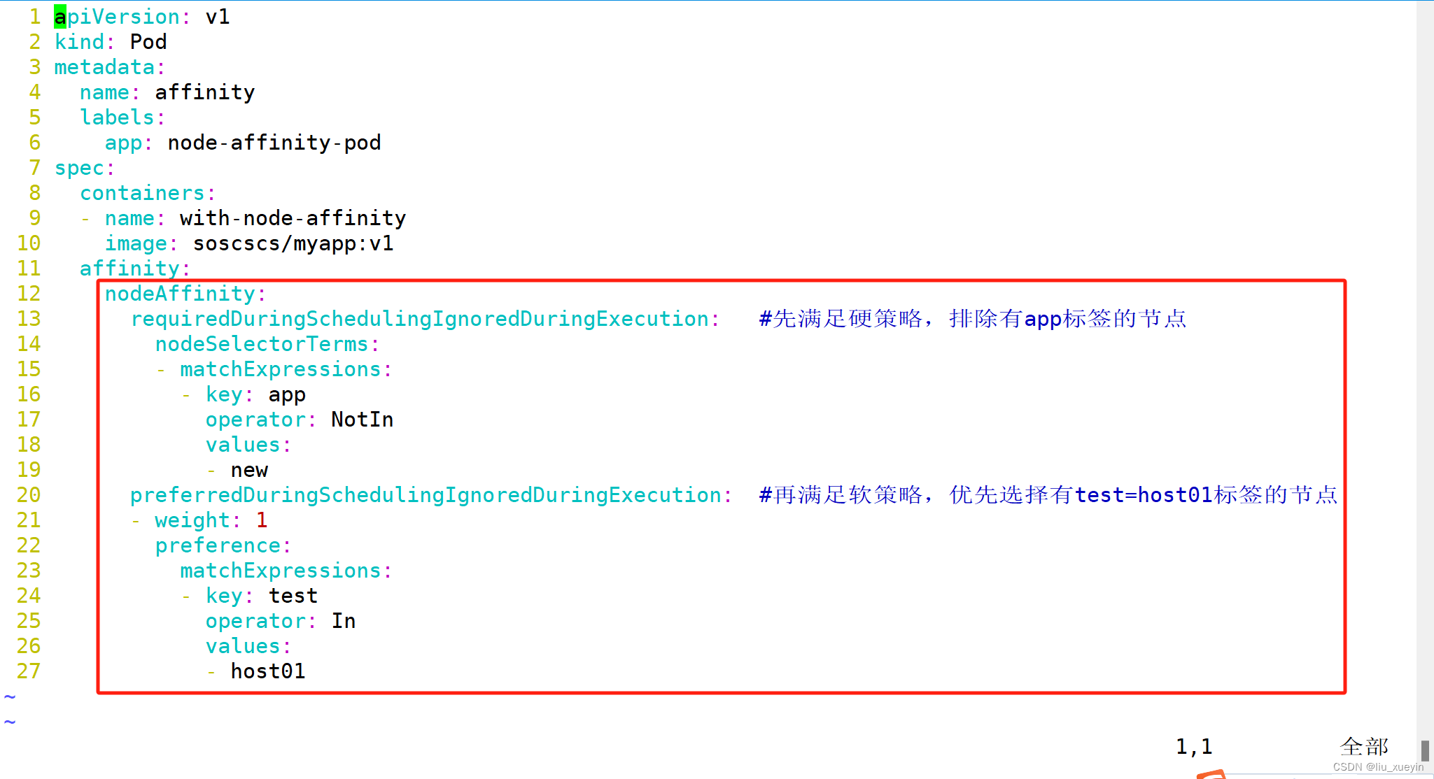 apiVersion: v1kind: Podmetadata: name: affinity labels: app: node-affinity-podspec: containers: - name: with-node-affinity image: soscscs/myapp:v1 affinity: nodeAffinity: requiredDuringSchedulingIgnoredDuringExecution: #先满足硬策略,排除有app标签的节点 nodeSelectorTerms: - matchExpressions: - key: app operator: NotIn values: - new preferredDuringSchedulingIgnoredDuringExecution: #再满足软策略,优先选择有test=host01标签的节点 - weight: 1 preference: matchExpressions: - key: test operator: In values: - host01