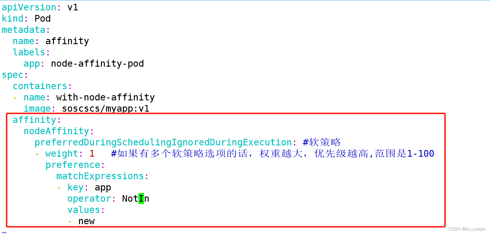 apiVersion: v1kind: Podmetadata: name: affinity labels: app: node-affinity-podspec: containers: - name: with-node-affinity image: soscscs/myapp:v1 affinity: nodeAffinity: preferredDuringSchedulingIgnoredDuringExecution: #软策略 - weight: 1 #如果有多个软策略选项的话,权重越大,优先级越高,范围是1-100 preference: matchExpressions: - key: app operator: NotIn values: - new