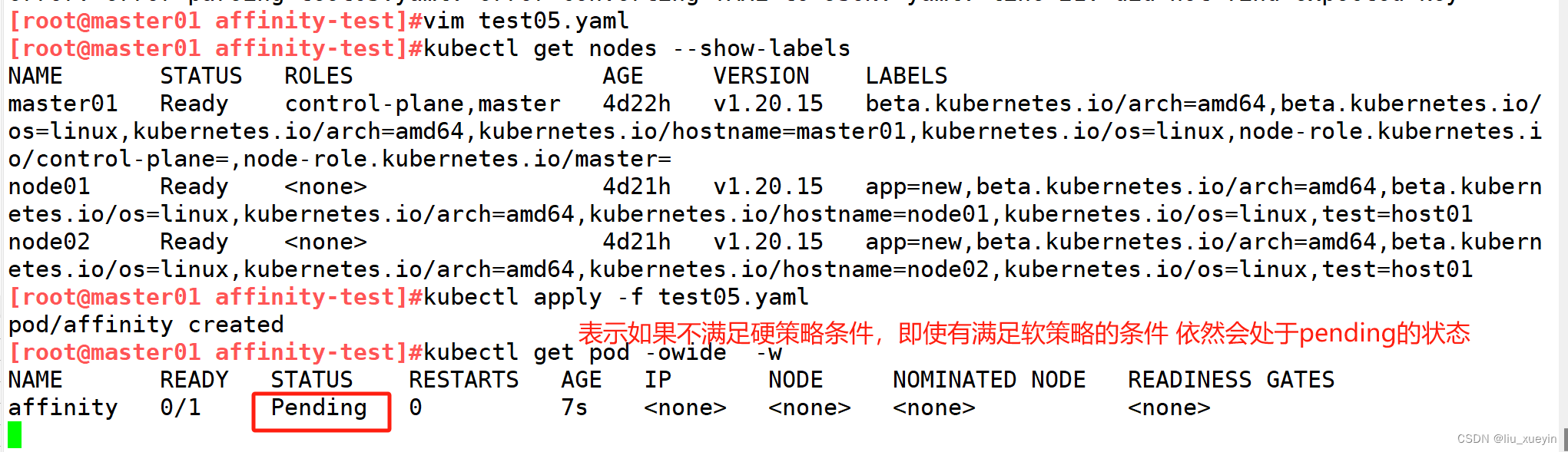 #如果硬策略不满足条件,Pod 状态一直会处于 Pending 状态。