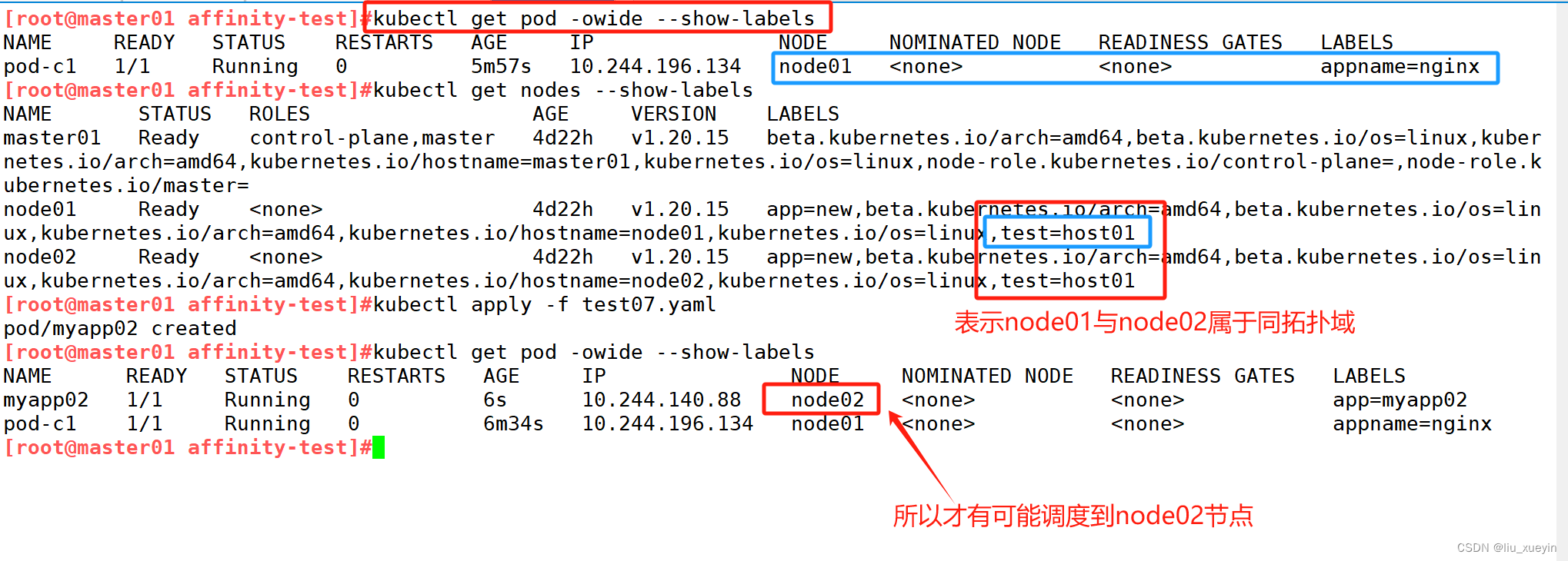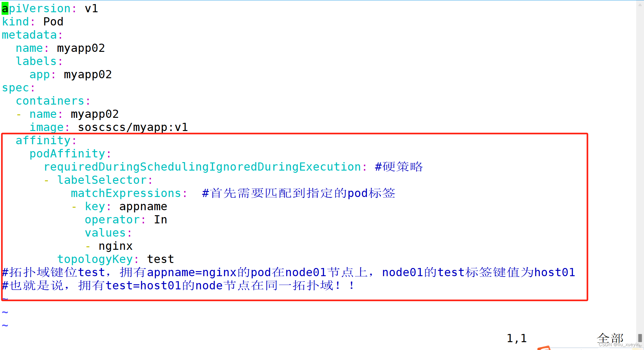 apiVersion: v1kind: Podmetadata: name: myapp02 labels: app: myapp02spec: containers: - name: myapp02 image: soscscs/myapp:v1 affinity: podAffinity: requiredDuringSchedulingIgnoredDuringExecution: #硬策略 - labelSelector: matchExpressions: #首先需要匹配到指定的pod标签 - key: appname operator: In values: - nginx topologyKey: test#拓扑域键位test,拥有appname=nginx的pod在node01节点上,node01的test标签键值为host01#也就是说,拥有test=host01的node节点在同一拓扑域!!
