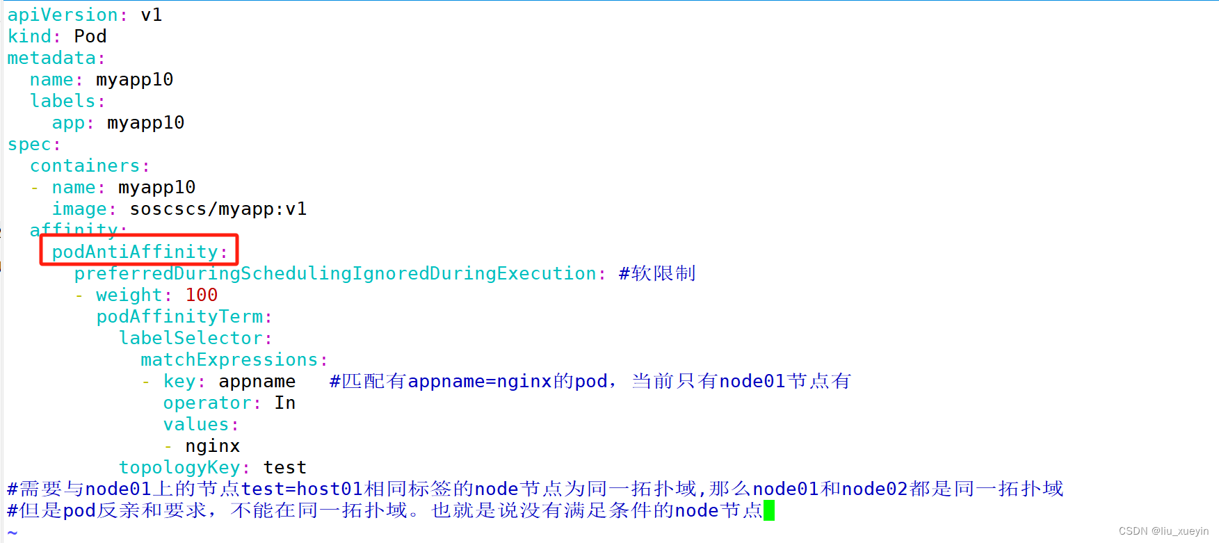 apiVersion: v1kind: Podmetadata: name: myapp10 labels: app: myapp10spec: containers: - name: myapp10 image: soscscs/myapp:v1 affinity: podAntiAffinity: preferredDuringSchedulingIgnoredDuringExecution: #软限制 - weight: 100 podAffinityTerm: labelSelector: matchExpressions: - key: appname #匹配有appname=nginx的pod,当前只有node01节点有 operator: In values: - nginx topologyKey: test #需要与node01上的节点test=host01相同标签的node节点为同一拓扑域,那么node01和node02都是同一拓扑域#但是pod反亲和要求,不能在同一拓扑域。也就是说没有满足条件的node节点