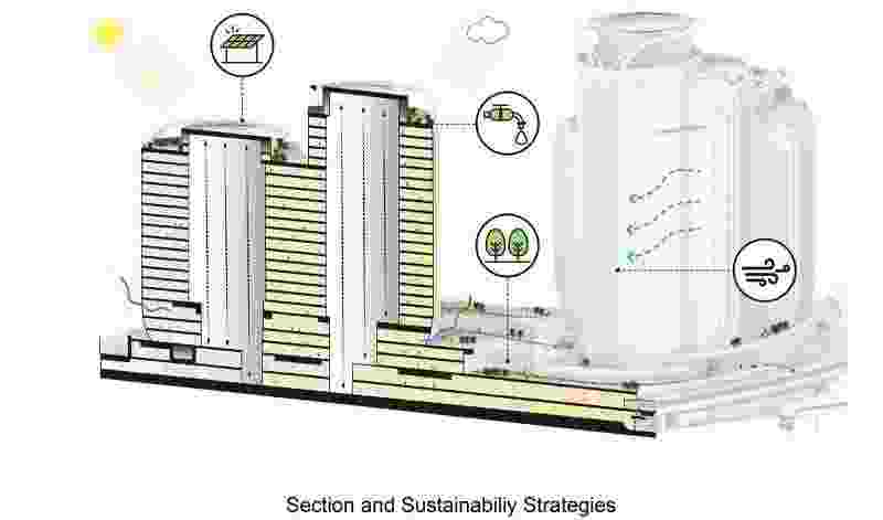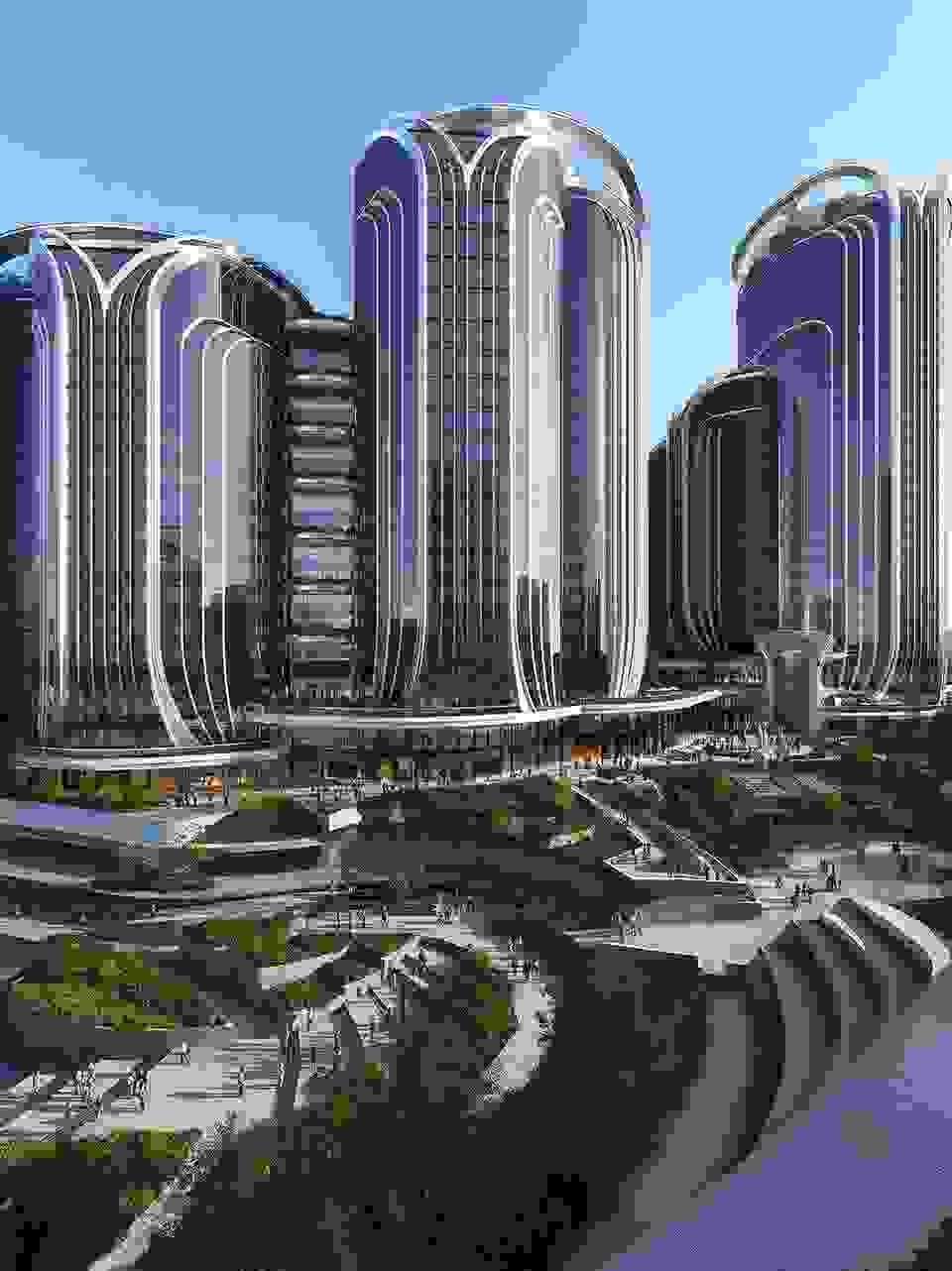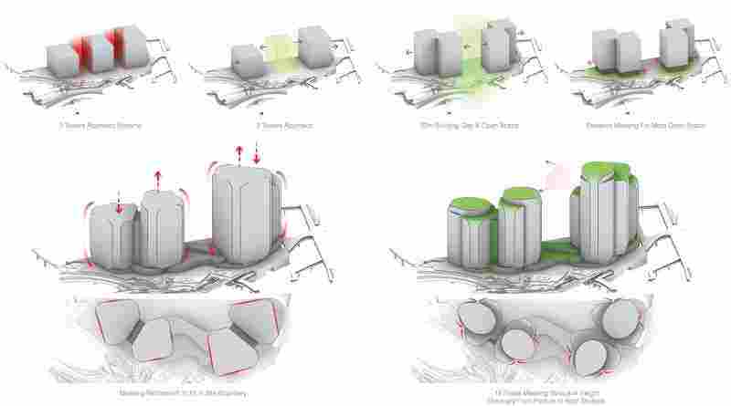 这些塔楼与车站上方的新景观平台和市民广场交织在一起,建筑体量从较低的楼层开始逐渐向内收缩,以减少占地面积,同时增加户外空间,促进人的流动和空气的流通。