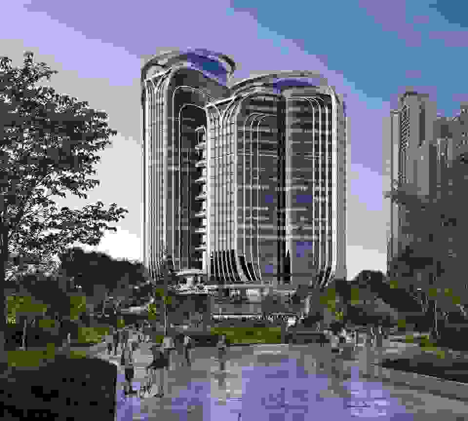 这些塔楼可以看作一系列相互连接的 “花瓣”,每片花瓣的朝向和高度各不相同,在西九龙的天际线上勾勒出一个动态的轮廓。每座塔楼的顶部都向内逐渐变细,体积逐渐减小,而立面的垂直遮阳褶皱则延伸至每个屋顶,形成 遮蔽屋顶露台和空中花园的“光环”。