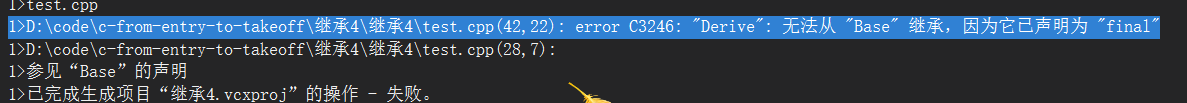 class Base final{public:void func5() { cout << "Base::func5" << endl; }Base(){}protected:int a = 1;private://C++98的⽅法 /*Base(){}*/};class Derive :public Base{void func4() { cout << "Derive::func4" << endl; }protected:int b = 2;};int main(){Derive d;return 0;}
