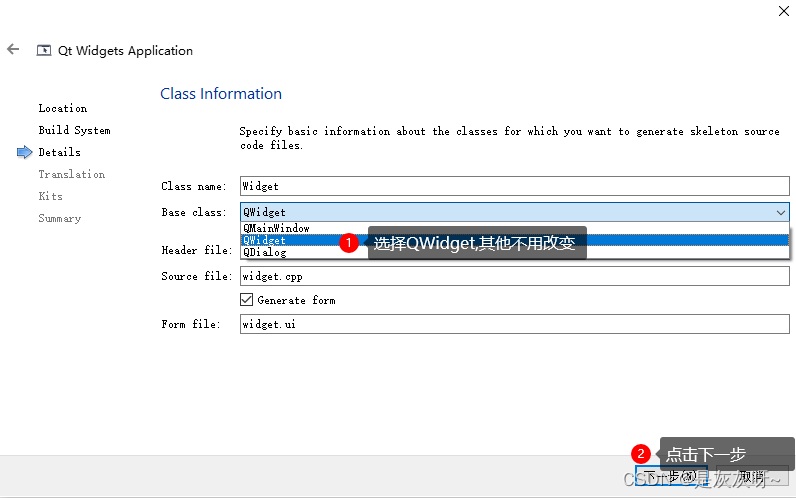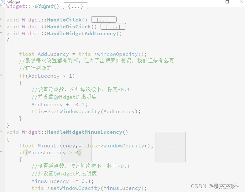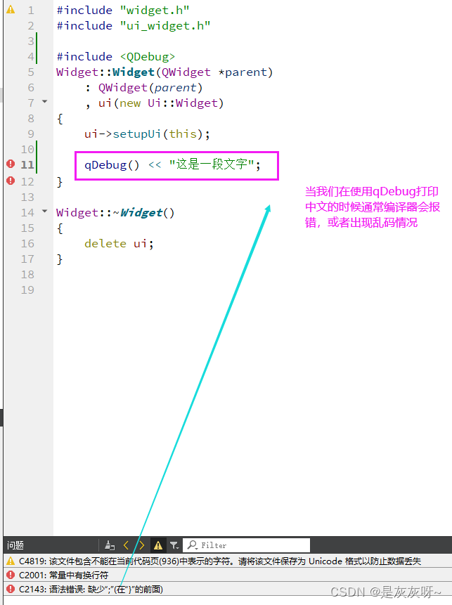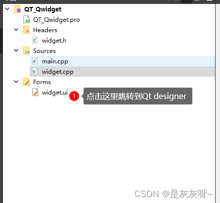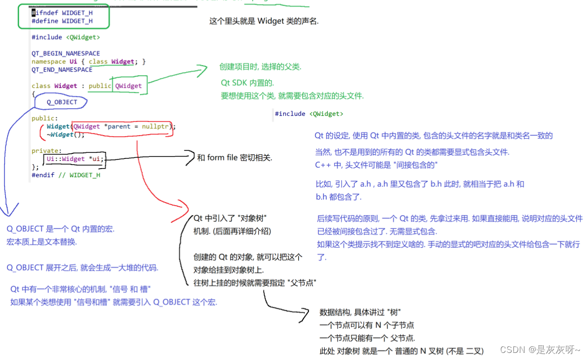 //防止头文件重复包含,自不必多说#ifndef WIDGET_H#define WIDGET_H//QWidget:创建Qt中控件的基类#include <QWidget>//QT_BEGIN_NAMESPACE,QT_END_NAMESPACE:用于定义命名空间,在这个命名空间中,定义了一个名为ui的命名空间,其中包含一个名为Widget的类。QT_BEGIN_NAMESPACE//此处是由 Qt Designer 自动生成,后续会解释什么是 Qt Designer namespace Ui { class Widget; }QT_END_NAMESPACE//Widget类的声明,他继承自Qwidget,表示Widget是一个窗口控件类//窗口控件:是用户界面的基本组成部分,用于创建和管理用户界面上的各种元素class Widget : public QWidget{//Qt元对象宏,类中声明一个Qt元对象类。//这个宏使得该类可以使用信号以及槽机制和其他元对象相关的功能//注:Qt中很多地方都使用了元编程,所谓的元编程,就是代码生成代码的一种编码手段 Q_OBJECTpublic://widget的构造函数和析构函数 Widget(QWidget *parent = nullptr); ~Widget();private://声明私用成员Ui::Widget *ui; Ui::Widget *ui;};#endif // WIDGET_H