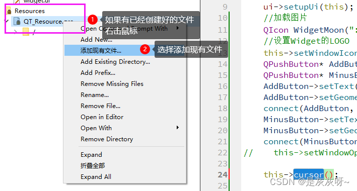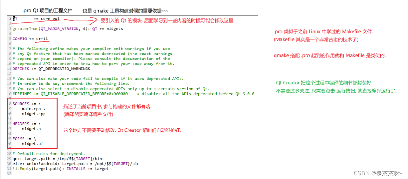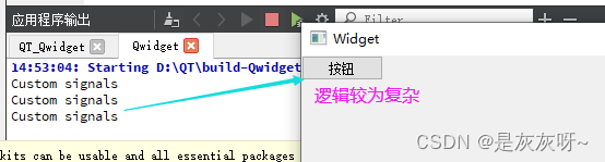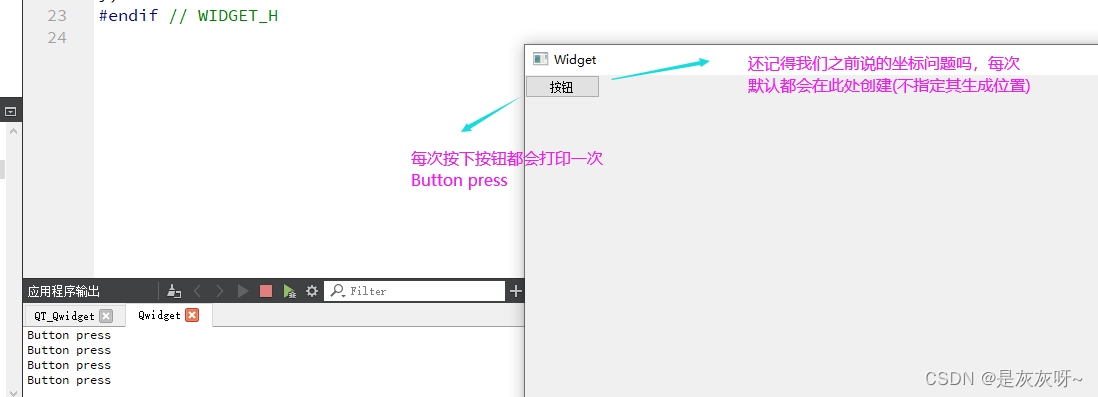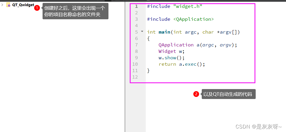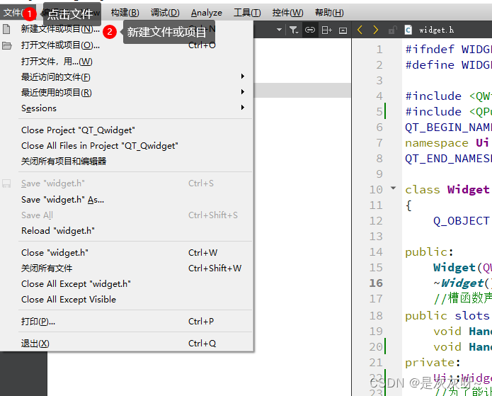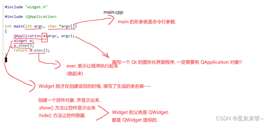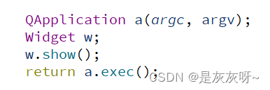 //自定义窗口部件的头文件,widget类定义了应用程序的主窗口,其包含//用户界面和其它江湖元素#include "widget.h"//这是我们之前选择QApplication,自己包含的头文件#include <QApplication>int main(int argc, char *argv[]){//创建一个QApplication对象a,它是Qt应用程序的主要对象//注:负责处理时间循环和应用程序的整体管理 QApplication a(argc, argv);//创建一个Widget对象w//注:调用其构造函数来初始化窗口控件 Widget w;//显示窗口控件,与之对应的w.hide()关闭显示 w.show();//启动Qt事件循环,处理用户触发事件,或者定时器等//exec会一直运行至程序终止,结束后会返回程序状态码 return a.exec();} 此处是一段简单的Qt程序入口函数,此处创建了一个应用程序对象,自定义窗口控件对象,并最终通过事件循环来驱动整个程序的运行。