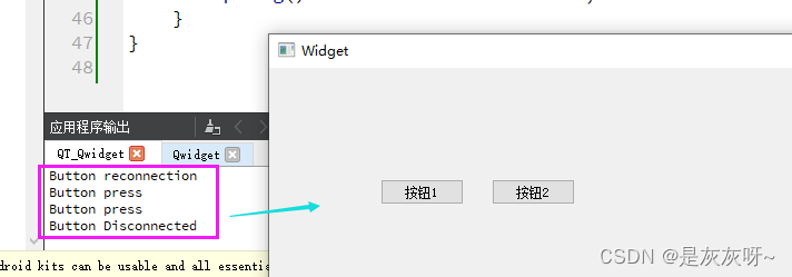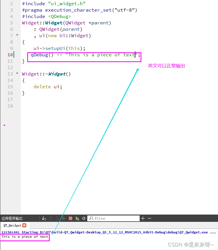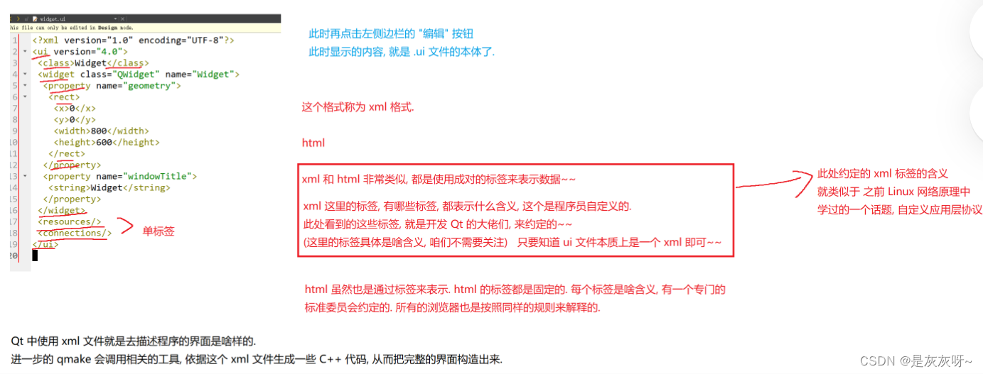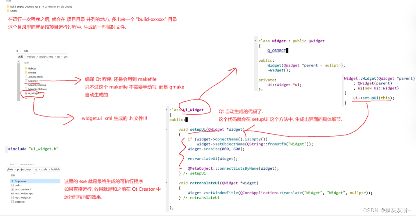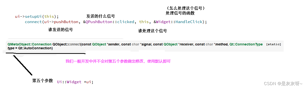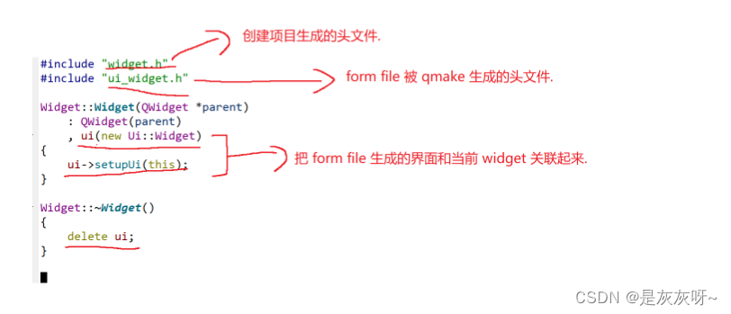 //Widget类的头文件,包含Widget的声明#include "widget.h"//包含ui_widget的头文件,是由Qt Designer自动生成的UI头文件//其中包含一个名为Widget的类,该类包含了UI界面中的所有控件#include "ui_widget.h"//widget的构造函数,接收一个QWidget类型的指针作为参数,表示该窗口控件的父类//在构造函数初始化列表中,首先调用了QWidget类的构造函数,将parent参数传递给//基类构造函数,然后产生新的Ui::Widget对象,并将其指针赋值给成员变量uiWidget::Widget(QWidget *parent) : QWidget(parent) , ui(new Ui::Widget){//调用ui所指向的对象setupUi()函数,将当前窗口的空间对象this作为参数传递给该函数。//setupUi()函数是由Qt Designer自动生成的,用于初始化UI界面中的空间。包括布局,控件大小,位置等 ui->setupUi(this);}//析构函数Widget::~Widget(){//释放资源,首先通过delete ui 释放之前构造函数动态分配对象ui 所占的内存空间 delete ui;}
