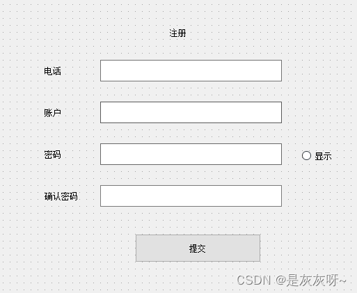 //默认禁止点击提交 ui->pushButton->setEnabled(false); void Widget::Compare(){ const QString& s1 = ui->lineEdit_password->text(); const QString& s2 = ui->lineEdit_affirm_password->text(); ui->pushButton->setEnabled(false); if (s1.isEmpty() && s2.isEmpty()) { ui->label->setText("Password is empty"); //如果两次输入的密码相等,且所有QLineEdit控件不为空就将“提交”设置为可用 } else if (s1 == s2 && !(ui->lineEdit_account->text().isEmpty()) && !(ui->lineEdit_phone->text().isEmpty())) { ui->label->setText("The passwords are the same"); ui->pushButton->setEnabled(true); } else { ui->label->setText("The password is not the same"); }}void Widget::on_lineEdit_password_textEdited(const QString &arg1){ //防止报警告 (void)arg1; Compare();}void Widget::on_lineEdit_affirm_password_textEdited(const QString &arg1){ //防止报警告 (void)arg1; Compare();} 我们还提供了显示按钮,当它按下就显示其密码内容