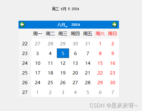 void Widget::on_calendarWidget_selectionChanged(){ QDate date = ui->calendarWidget->selectedDate();// qDebug() << date; //将date转为string ui->label->setText(date.toString());} 运行结果: