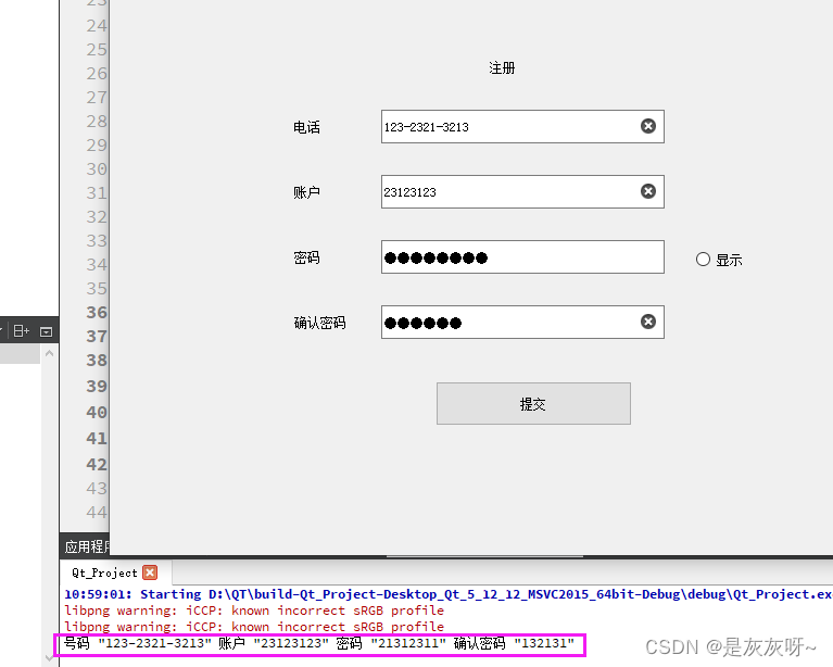 //初始化第一个框提示文本“请输入您的电话号码” ui->lineEdit_phone->setPlaceholderText(QString("Please enter your telephone number")); ui->lineEdit_phone->setClearButtonEnabled(true); //手机号码具有固定格式,此处的“0”代表数字 ui->lineEdit_phone->setInputMask("000-0000-0000"); //初始第二框文本“请输入账户” ui->lineEdit_account->setPlaceholderText(QString("Please enter account")); ui->lineEdit_account->setClearButtonEnabled(true); //第三,四框输入文本“请输入密码”和“请确认密码” ui->lineEdit_password->setPlaceholderText(QString("enter your PIN")); ui->lineEdit_affirm_password->setPlaceholderText(QString("Please confirm password")); //密码不希望被其他人知晓所以显示设置为密码模式 ui->lineEdit_password->setEchoMode(QLineEdit::Password); ui->lineEdit_affirm_password->setEchoMode(QLineEdit::Password); ui->lineEdit_phone->setClearButtonEnabled(true); ui->lineEdit_affirm_password->setClearButtonEnabled(true); void Widget::on_pushButton_clicked(){ qDebug() <<"号码"<<ui->lineEdit_phone->text() <<"账户"<<ui->lineEdit_account->text() <<"密码"<<ui->lineEdit_password->text() <<"确认密码"<<ui->lineEdit_affirm_password->text();} 运行结果