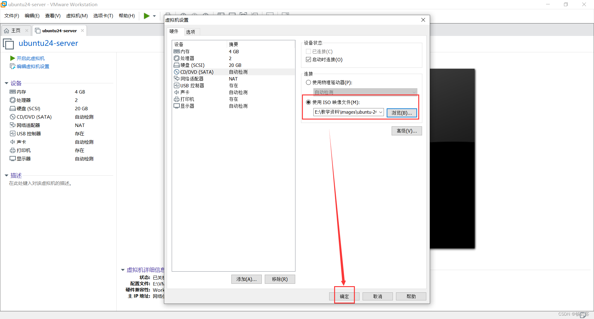 选择提前下载好的ISO镜像文件,然后点击确定,没有ISO镜像文件的可以通过该地址下载https://mirrors.aliyun.com/ubuntu-releases/noble/ubuntu-24.04-live-server-amd64.iso