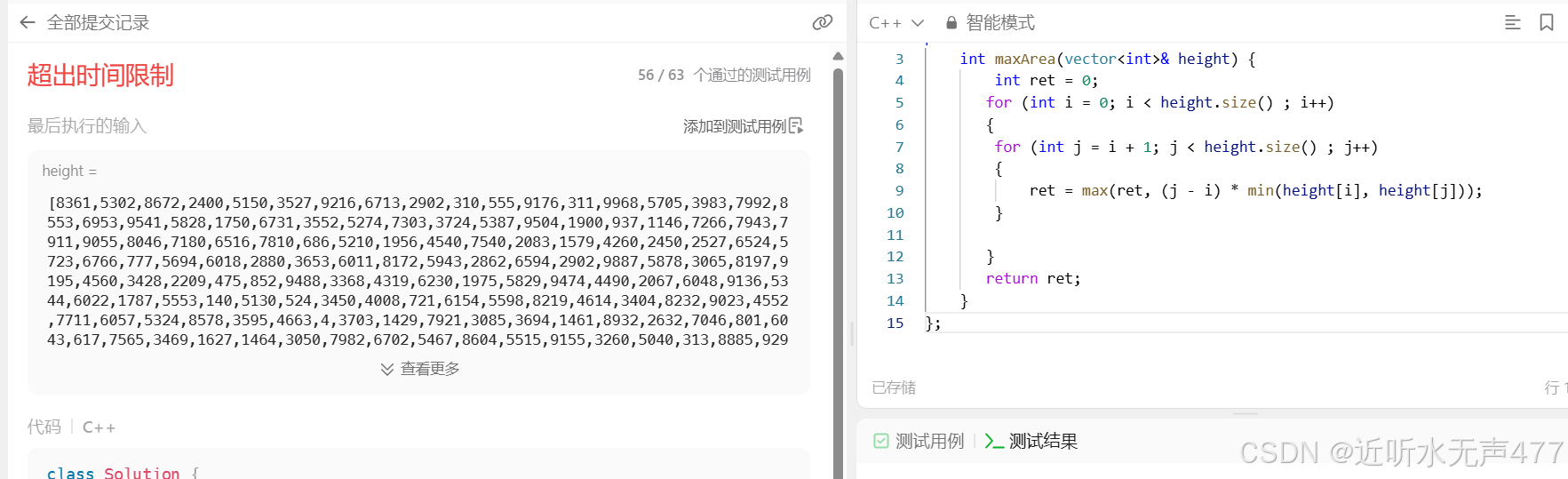 class Solution {public: int maxArea(vector<int>& height) { int ret = 0; for (int i = 0; i < height.size() ; i++) { for (int j = i + 1; j < height.size() ; j++) { ret = max(ret, (j - i) * min(height[i], height[j])); } } return ret; }};