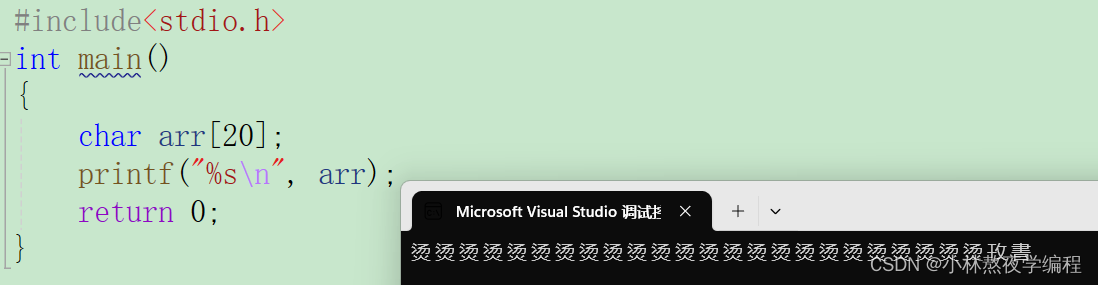 之所以上面的程序输出“烫”这么一个奇怪的字,是因为main函数调用时,在栈区开辟的空间的其中每一个字节都被初始化为0xCC,而arr数组是一个未初始化的数组,恰好在这块空间上创建的,0xCCCC(两个连续排列的0xCC)的汉字编码就是“烫”,所以0xCCCC被当作文本就是“烫”。