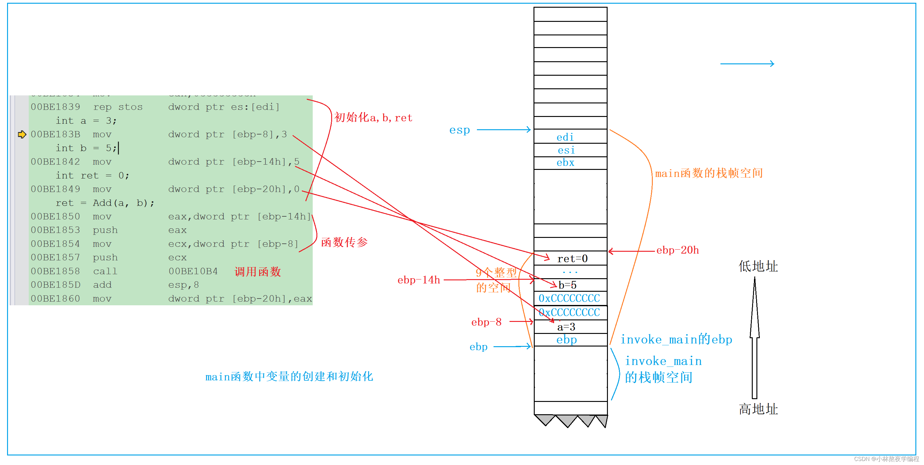 int main(){//函数栈帧的创建00BE1820 push ebp00BE1821 mov ebp, esp00BE1823 sub esp, 0E4h00BE1829 push ebx00BE182A push esi00BE182B push edi00BE182C lea edi, [ebp - 24h]00BE182F mov ecx, 900BE1834 mov eax, 0CCCCCCCCh00BE1839 rep stos dword ptr es : [edi]//main函数中的核心代码int a = 3;00BE183B mov dword ptr[ebp - 8], 3int b = 5;00BE1842 mov dword ptr[ebp - 14h], 5int ret = 0;00BE1849 mov dword ptr[ebp - 20h], 0ret = Add(a, b);00BE1850 mov eax, dword ptr[ebp - 14h]00BE1853 push eax00BE1854 mov ecx, dword ptr[ebp - 8]00BE1857 push ecx00BE1858 call 00BE10B400BE185D add esp, 800BE1860 mov dword ptr[ebp - 20h], eaxprintf("%d\n", ret);00BE1863 mov eax, dword ptr[ebp - 20h]00BE1866 push eax00BE1867 push 0BE7B30h00BE186C call 00BE10D200BE1871 add esp, 8return 0;00BE1874 xor eax, eax} 3.3.6 函数栈帧的创建