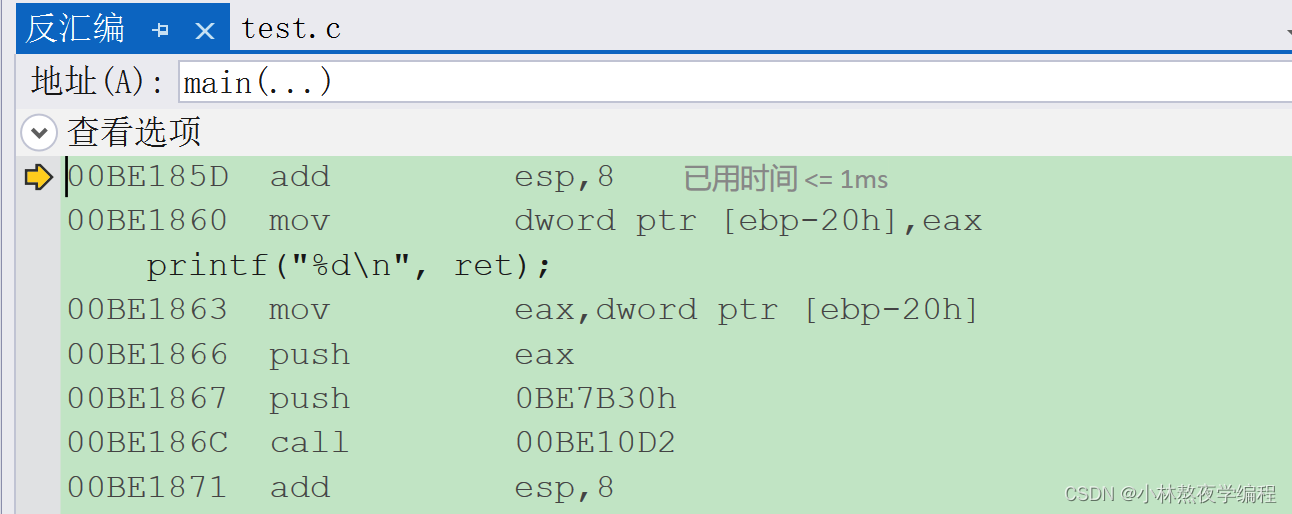 00BE185D add esp, 8 //esp直接+8,相当于跳过了main函数中压栈的a'和b'00BE1860 mov dword ptr[ebp - 20h], eax //将eax中值,存档到ebp-0x20的地址处,其实就是存储到main函数中ret变量中,//而此时eax中就是Add函数中计算的x和y的和,可以看出来,本次函数的返回值是由eax寄存器带回来的。//程序是在函数调用返回之后,在eax中去读取返回值的。 拓展了解: